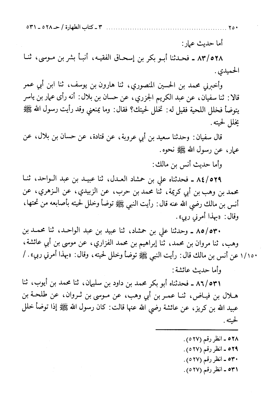 529 - فَحَدَّثَنَاهُ عَلِيُّ بْنُ حَمْشَاذَ الْعَدْلُ، ثنا عُبَيْدُ بْنُ عَبْدِ الْوَاحِدِ، ثنا مُحَمَّدُ بْنُ وَهْبِ بْنِ أَبِي كَرِيمَةَ، ثنا مُحَمَّدُ بْنُ حَرْبٍ، عَنِ الزُّبَيْدِيِّ، عَنِ الزُّهْرِيِّ، عَنْ أَنَسِ بْنِ مَالِكٍ رَضِيَ اللَّهُ عَنْهُ، قَالَ: رَأَيْتُ النَّبِيَّ صَلَّى اللهُ عَلَيْهِ وَسَلَّمَ «§تَوَضَّأَ وَخَلَّلَ لِحْيَتَهُ بِأَصَابِعِهِ مِنْ تَحْتِهَا» ، وَقَالَ: «بِهَذَا أَمَرَنِي رَبِّي»