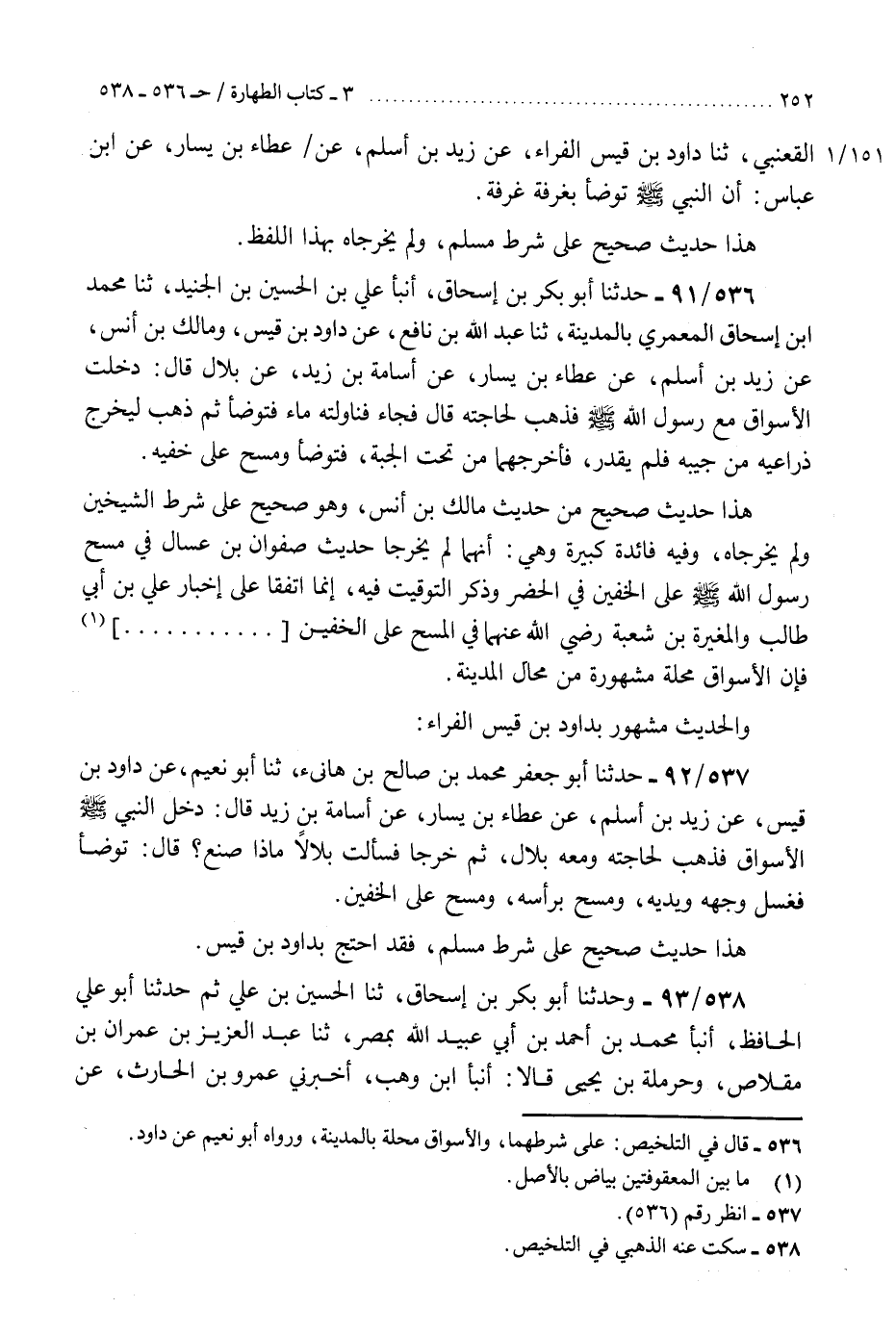 536 - حَدَّثَنَا أَبُو بَكْرِ بْنُ إِسْحَاقَ، أَنْبَأَ عَلِيُّ بْنُ الْحُسَيْنِ بْنِ الْجُنَيْدِ، ثنا مُحَمَّدُ بْنُ إِسْحَاقَ الْمَعْمَرِيُّ، بِالْمَدِينَةِ، ثنا عَبْدُ اللَّهِ بْنُ نَافِعٍ، عَنْ دَاوُدَ بْنِ قَيْسٍ، وَمَالِكِ بْنِ أَنَسٍ، عَنْ زَيْدِ بْنِ أَسْلَمَ، عَنْ عَطَاءِ بْنِ يَسَارٍ، عَنْ أُسَامَةَ بْنِ زَيْدٍ، عَنْ بِلَالٍ، قَالَ: «دَخَلْتُ الْأَسْوَاقَ مَعَ رَسُولِ اللَّهِ صَلَّى اللهُ عَلَيْهِ وَسَلَّمَ فَذَهَبَ لِحَاجَتِهِ» ، قَالَ: «فَجَاءَ §فَنَاوَلْتُهُ مَاءً فَتَوَضَّأَ ثُمَّ ذَهَبَ لِيُخْرِجَ ذِرَاعَيْهِ مِنْ جَيْبِهِ فَلَمْ يَقْدِرْ، فَأَخْرَجَهُمَا مِنْ تَحْتِ الْجُبَّةِ، فَتَوَضَّأَ وَمَسَحَ عَلَى خُفَّيْهِ» . " هَذَا حَدِيثٌ صَحِيحٌ مِنْ حَدِيثِ مَالِكِ بْنِ أَنَسٍ وَهُوَ صَحِيحٌ عَلَى شَرْطِ الشَّيْخَيْنِ وَلَمْ يُخَرِّجَاهُ وَفِيهِ فَائِدَةٌ كَبِيرَةٌ وَهِيَ: أَنَّهُمَا لَمْ يُخَرِّجَا حَدِيثَ صَفْوَانَ بْنِ عَسَّالٍ فِي مَسْحِ رَسُولِ اللَّهِ صَلَّى اللهُ عَلَيْهِ وَسَلَّمَ عَلَى الْخُفَّيْنِ فِي الْحَضَرِ، وَذِكْرَ التَّوْقِيتِ فِيهِ، إِنَّمَا اتَّفَقَا عَلَى إِخْبَارِ عَلِيِّ بْنِ أَبِي طَالِبٍ، وَالْمُغِيرَةِ بْنِ شُعْبَةَ رَضِيَ اللَّهُ عَنْهُمَا فِي الْمَسْحِ عَلَى الْخُفَّيْنِ. . . . فَإِنَّ الْأَسْوَاقَ مَحِلَّةٌ مَشْهُورَةٌ مِنْ مَحَالِّ الْمَدِينَةِ، وَالْحَدِيثُ مَشْهُورٌ بِدَاوُدَ بْنِ قَيْسٍ الْفَرَّاءِ "K536 - على شرطهما