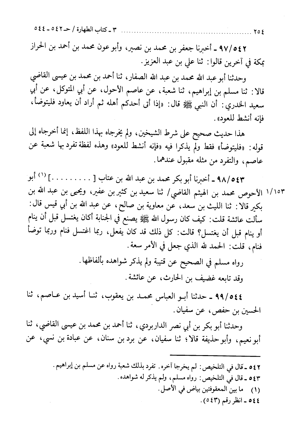 542 - أَخْبَرَنَا جَعْفَرُ بْنُ مُحَمَّدِ بْنِ نُصَيْرٍ، وَأَبُو عَوْنٍ مُحَمَّدُ بْنُ أَحْمَدَ بْنِ الْحَرَازُ بِمَكَّةَ فِي آخَرِينَ، قَالُوا: ثنا عَلِيُّ بْنُ عَبْدِ الْعَزِيزِ، وَحَدَّثَنَا أَبُو عَبْدِ اللَّهِ مُحَمَّدُ بْنُ عَبْدِ اللَّهِ الصَّفَّارُ، ثنا أَحْمَدُ بْنُ مُحَمَّدِ بْنِ عِيسَى الْقَاضِي، قَالَا: ثنا مُسْلِمُ بْنُ إِبْرَاهِيمَ، ثنا شُعْبَةُ، عَنْ عَاصِمٍ الْأَحْوَلِ، عَنْ أَبِي الْمُتَوَكِّلِ، عَنْ أَبِي سَعِيدٍ الْخُدْرِيِّ، أَنَّ النَّبِيَّ صَلَّى اللهُ عَلَيْهِ وَسَلَّمَ، قَالَ: «§إِذَا أَتَى أَحَدُكُمْ أَهْلَهُ ثُمَّ أَرَادَ أَنْ يُعَاوِدَ فَلْيَتَوَضَّأْ، فَإِنَّهُ أَنْشَطُ لِلْعَوْدِ» . «هَذَا حَدِيثٌ صَحِيحٌ عَلَى شَرْطِ الشَّيْخَيْنِ، وَلَمْ يُخَرِّجَاهُ بِهَذَا اللَّفْظِ، إِنَّمَا أَخْرَجَاهُ إِلَى قَوْلِهِ» فَلْيَتَوَضَّأْ «فَقَطْ، وَلَمْ يَذْكُرَا فِيهِ» فَإِنَّهُ أَنْشَطُ لِلْعَوْدِ «وَهَذِهِ لَفْظَةٌ تَفَرَّدَ بِهَا شُعْبَةُ، عَنْ عَاصِمٍ، وَالتَّفَرُّدُ مِنْ مِثْلِهِ مَقْبُولٌ عِنْدَهُمَا» K542 - لم يخرجا آخره