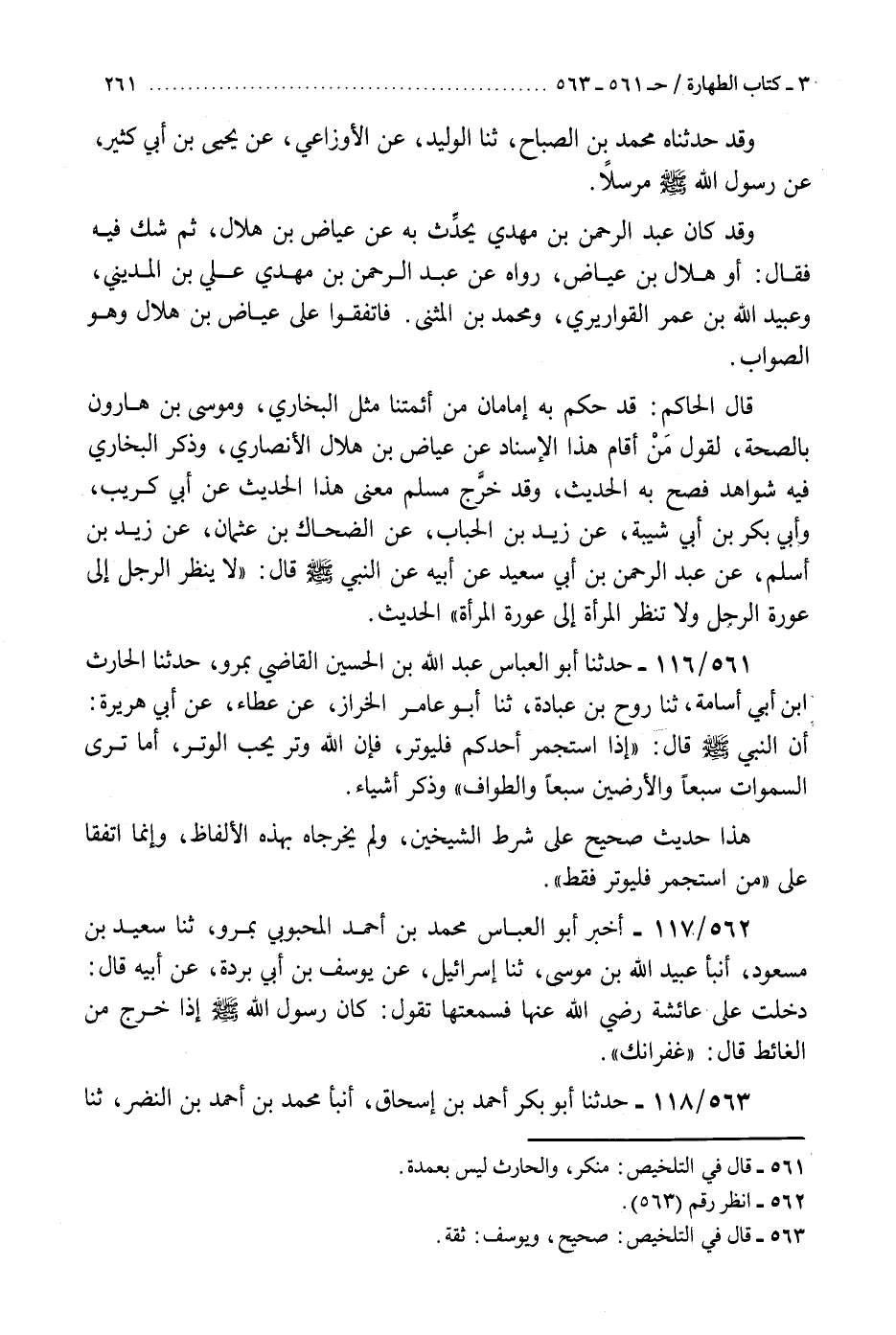 561 - حَدَّثَنَا أَبُو الْعَبَّاسِ عَبْدُ اللَّهِ بْنُ الْحُسَيْنِ الْقَاضِي، بِمَرْوَ، حَدَّثَنَا الْحَارِثُ بْنُ أَبِي أُسَامَةَ، ثنا رَوْحُ بْنُ عُبَادَةَ، ثنا أَبُو عَامِرٍ الْخَرَّازُ، عَنْ عَطَاءٍ، عَنْ أَبِي هُرَيْرَةَ، أَنَّ النَّبِيَّ صَلَّى اللهُ عَلَيْهِ وَسَلَّمَ، قَالَ: «§إِذَا اسْتَجْمَرَ أَحَدُكُمْ فَلْيُوتِرْ، فَإِنَّ اللَّهَ وِتْرٌ يُحِبُّ الْوِتْرَ، أَمَا تَرَى السَّمَاوَاتِ سَبْعًا، وَالْأَرَضِينَ سَبْعًا، وَالطَّوَافَ» وَذَكَرَ أَشْيَاءَ. «هَذَا حَدِيثٌ صَحِيحٌ عَلَى شَرْطِ الشَّيْخَيْنِ، وَلَمْ يُخَرِّجَاهُ بِهَذِهِ الْأَلْفَاظِ إِنَّمَا اتَّفَقَا عَلَى» مَنِ اسْتَجْمَرَ فَلْيُوتِرْ «فَقَطْ» K561 - منكر والحارث ليس بعمدة