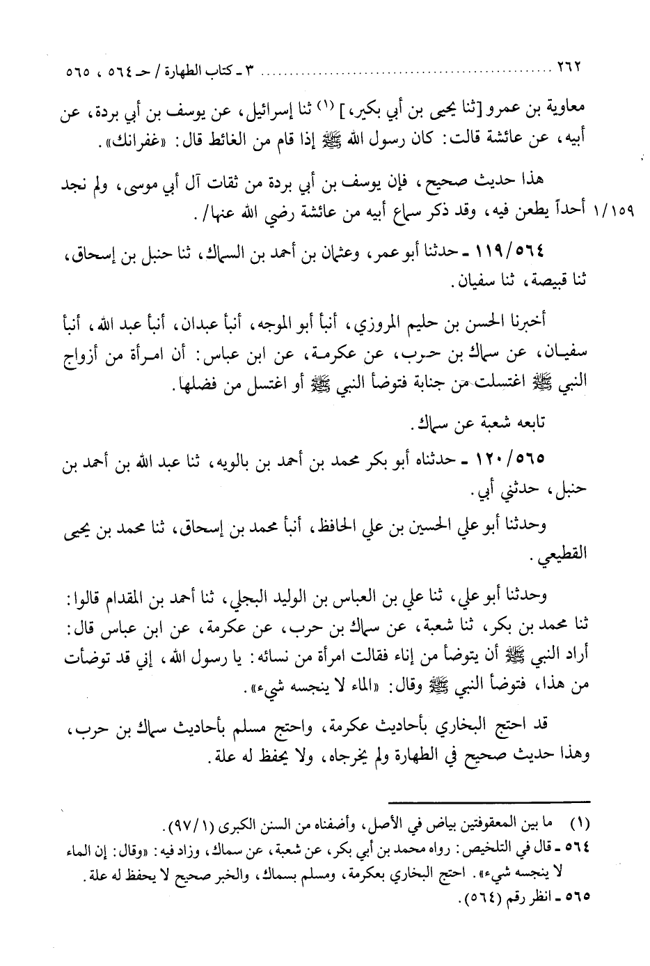 565 - حَدَّثَنَاهُ أَبُو بَكْرٍ مُحَمَّدُ بْنُ أَحْمَدَ بْنِ بَالَوَيْهِ، ثنا عَبْدُ اللَّهِ بْنُ أَحْمَدَ بْنِ حَنْبَلٍ، حَدَّثَنِي أَبِي، وَحدثنا أَبُو عَلِيٍّ الْحُسَيْنُ بْنُ عَلِيٍّ الْحَافِظُ، أَنْبَأَ مُحَمَّدُ بْنُ إِسْحَاقَ، ثنا مُحَمَّدُ بْنُ يَحْيَى الْقَطِيعِيُّ، وَحَدَّثَنَا أَبُو عَلِيٍّ، ثنا عَلِيُّ بْنُ الْعَبَّاسِ بْنِ الْوَلِيدِ الْبَجَلِيُّ، ثنا أَحْمَدُ بْنُ الْمِقْدَامِ، قَالُوا: ثنا مُحَمَّدُ بْنُ بَكْرٍ، ثنا شُعْبَةُ، عَنْ سِمَاكِ بْنِ حَرْبٍ، عَنْ عِكْرِمَةَ، عَنِ ابْنِ عَبَّاسٍ، قَالَ: أَرَادَ النَّبِيُّ صَلَّى اللهُ عَلَيْهِ وَسَلَّمَ أَنْ يَتَوَضَّأَ مِنْ إِنَاءٍ فَقَالَتِ امْرَأَةٌ مِنْ نِسَائِهِ: يَا رَسُولَ اللَّهِ إِنِّي قَدْ تَوَضَّأْتُ مِنْ هَذَا، فَتَوَضَّأَ النَّبِيُّ صَلَّى اللهُ عَلَيْهِ وَسَلَّمَ، وقَالَ: §«الْمَاءُ لَا يُنَجِّسُهُ شَيْءٌ» قَدِ احْتَجَّ الْبُخَارِيُّ بِأَحَادِيثِ عِكْرِمَةَ، وَاحْتَجَّ مُسْلِمٌ بِأَحَادِيثِ سِمَاكِ بْنِ حَرْبٍ، وَهَذَا حَدِيثٌ صَحِيحٌ فِي الطَّهَارَةِ، وَلَمْ يُخْرِجَاهُ، وَلَا يُحْفَظُ لَهُ عِلَّةٌ