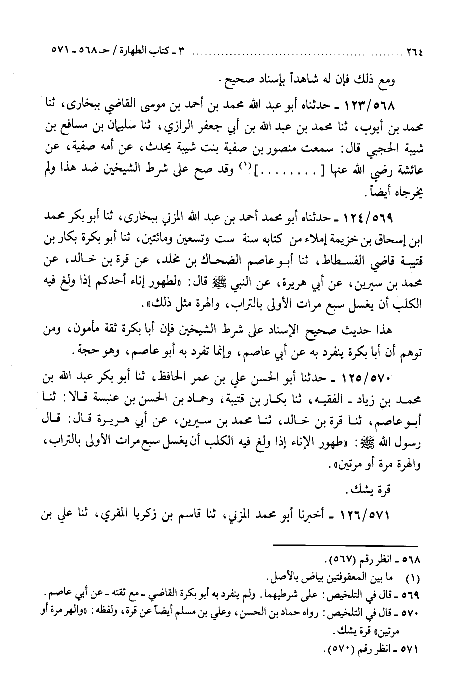 569 - حَدَّثَنَاهُ أَبُو مُحَمَّدٍ أَحْمَدُ بْنُ عَبْدِ اللَّهِ الْمُزَنِيُّ بِبُخَارَى، ثنا أَبُو بَكْرٍ مُحَمَّدُ بْنُ إِسْحَاقَ بْنِ خُزَيْمَةَ إِمْلَاءً مِنْ كِتَابِهِ سَنَةَ سِتٍّ وَتِسْعِينَ وَمِائَتَيْنِ، ثنا أَبُو بَكْرَةَ بَكَّارُ بْنُ قُتَيْبَةَ قَاضِي الْفُسْطَاطِ، ثنا أَبُو عَاصِمٍ الضَّحَّاكُ بْنُ مَخْلَدٍ، عَنْ قُرَّةَ بْنِ خَالِدٍ، عَنْ مُحَمَّدِ بْنِ سِيرِينَ، عَنْ أَبِي هُرَيْرَةَ، عَنِ النَّبِيِّ صَلَّى اللهُ عَلَيْهِ وَسَلَّمَ، قَالَ: §«لَطُهُورُ إِنَاءِ أَحَدِكُمْ إِذَا وَلَغَ فِيهِ الْكَلْبُ أَنْ يُغْسَلَ سَبْعَ مَرَّاتٍ، الْأُولَى بِالتُّرَابِ، وَالْهِرَّةُ مِثْلُ ذَلِكَ» . «هَذَا حَدِيثٌ صَحِيحُ الْإِسْنَادِ عَلَى شَرْطِ الشَّيْخَيْنِ، فَإِنَّ أَبَا بَكْرَةَ ثِقَةٌ مَأْمُونٌ، وَمَنْ تَوَهَّمَ أَنَّ أَبَا بَكْرَةَ يَنْفَرِدُ بِهِ، عَنْ أَبِي عَاصِمٍ، وَإِنَّمَا تَفَرَّدَ بِهِ أَبُو عَاصِمٍ وَهُوَ حُجَّةٌ» K569 - على شرطيهما
