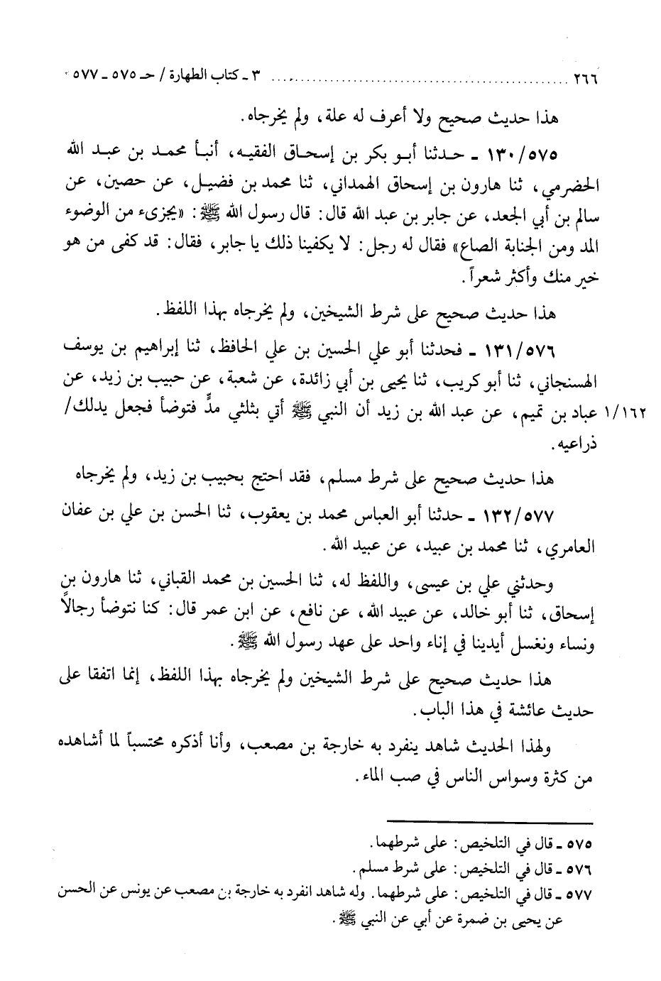 577 - حَدَّثَنَا أَبُو الْعَبَّاسِ مُحَمَّدُ بْنُ يَعْقُوبَ، ثنا الْحَسَنُ بْنُ عَلِيِّ بْنِ عَفَّانَ الْعَامِرِيُّ، ثنا مُحَمَّدُ بْنُ عُبَيْدٍ، عَنْ عُبَيْدِ اللَّهِ، وَحَدَّثَنِي عَلِيُّ بْنُ عِيسَى، وَاللَّفْظُ لَهُ، ثنا الْحُسَيْنُ بْنُ مُحَمَّدٍ الْقَبَّانِيُّ، ثنا هَارُونُ بْنُ إِسْحَاقَ، ثنا أَبُو خَالِدٍ، عَنْ عُبَيْدِ اللَّهِ، عَنْ نَافِعٍ، عَنِ ابْنِ عُمَرَ، قَالَ: §«كُنَّا نَتَوَضَّأُ رِجَالًا وَنِسَاءً وَنَغْسِلُ أَيْدِيَنَا فِي إِنَاءٍ وَاحِدٍ عَلَى عَهْدِ رَسُولِ اللَّهِ صَلَّى اللهُ عَلَيْهِ وَسَلَّمَ» . «هَذَا حَدِيثٌ صَحِيحٌ عَلَى شَرْطِ الشَّيْخَيْنِ وَلَمْ يُخَرِّجَاهُ بِهَذَا اللَّفْظِ» . إِنَّمَا اتَّفَقَا عَلَى حَدِيثِ عَائِشَةَ فِي هَذَا الْبَابِ. «وَلِهَذَا الْحَدِيثِ شَاهِدٌ يَنْفَرِدُ بِهِ خَارِجَةُ بْنُ مُصْعَبٍ وَأَنَا أَذْكُرَهُ مُحْتَسِبًا لِمَا أُشَاهِدُهُ مِنْ كَثْرَةِ وَسْوَاسِ النَّاسِ فِي صَبِّ الْمَاءِ» K577 - على شرطهما