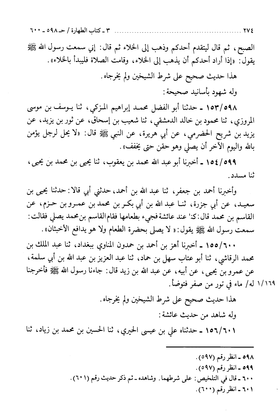 598 - حَدَّثَنَا أَبُو الْفَضْلِ مُحَمَّدُ بْنُ إِبْرَاهِيمَ الْمُزَكِّي، ثنا يُوسُفُ بْنُ مُوسَى الْمَرْوَزِيُّ، ثنا مَحْمُودُ بْنُ خَالِدٍ الدِّمَشْقِيُّ، ثنا شُعَيْبُ بْنُ إِسْحَاقَ، عَنْ ثَوْرِ بْنِ يَزِيدَ، عَنْ يَزِيدَ بْنِ شُرَيْحٍ الْحَضْرَمِيِّ، عَنْ أَبِي هُرَيْرَةَ، عَنِ النَّبِيِّ صَلَّى اللهُ عَلَيْهِ وَسَلَّمَ، قَالَ: §«لَا يَحِلُّ لِرَجُلٍ يُؤْمِنُ بِاللَّهِ وَالْيَوْمِ الْآخِرِ أَنْ يُصَلِّيَ وَهُوَ حَقِنٌ حَتَّى يُخَفِّفَ»