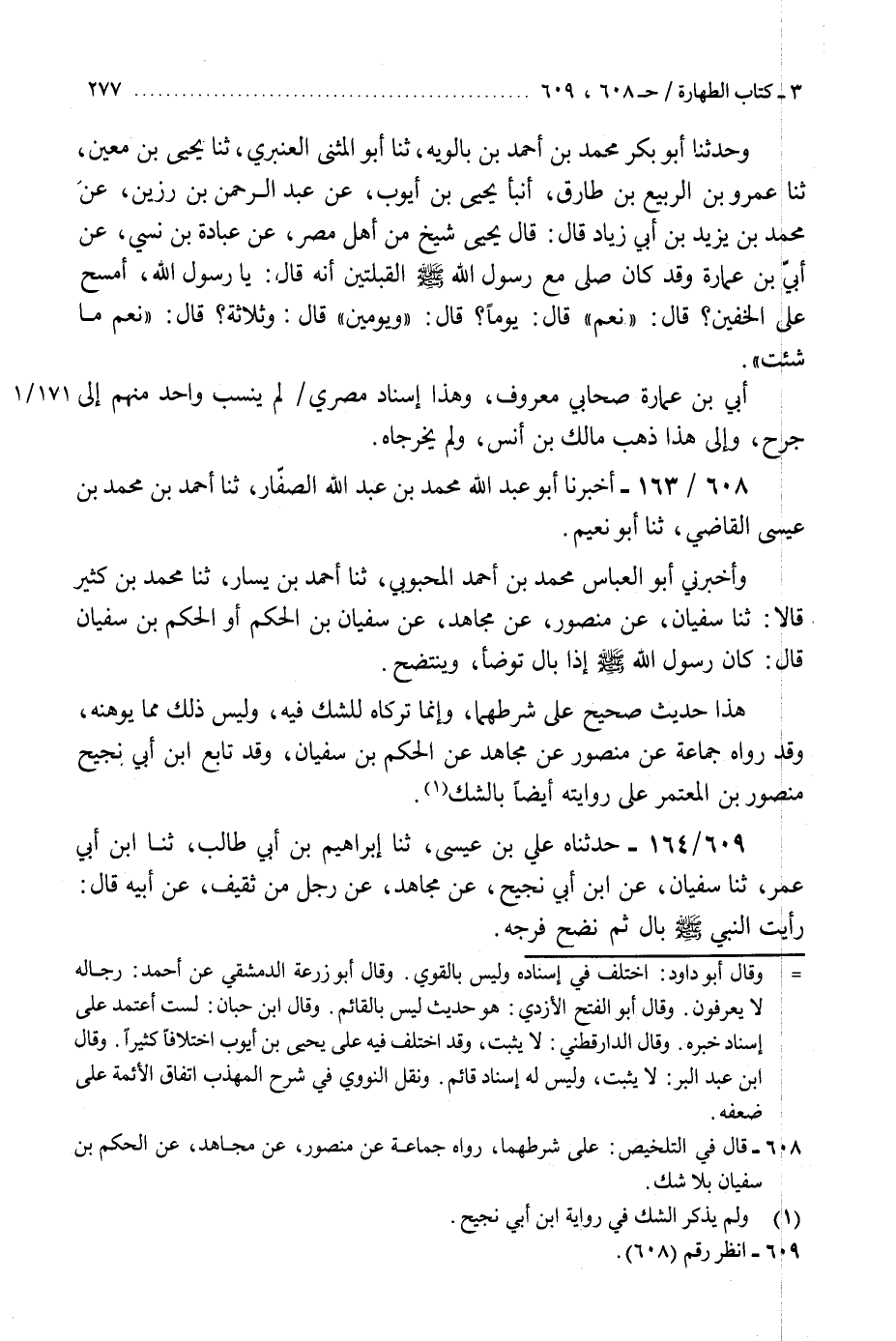 608 - أَخْبَرَنَا أَبُو عَبْدِ اللَّهِ مُحَمَّدُ بْنُ عَبْدِ اللَّهِ الصَّفَّارُ، ثنا أَحْمَدُ بْنُ مُحَمَّدِ بْنِ عِيسَى الْقَاضِي، ثنا أَبُو نُعَيْمٍ، وَأَخْبَرَنِي أَبُو الْعَبَّاسِ مُحَمَّدُ بْنُ أَحْمَدَ الْمَحْبُوبِيُّ، ثنا أَحْمَدُ بْنُ سَيَّارٍ، ثنا مُحَمَّدُ بْنُ كَثِيرٍ، قَالَا: ثنا سُفْيَانُ، عَنْ مَنْصُورٍ، عَنْ مُجَاهِدٍ، عَنْ سُفْيَانَ بْنِ الْحَكَمِ، أَوِ الْحَكَمِ بْنِ سُفْيَانَ، قَالَ: «كَانَ رَسُولُ اللَّهِ صَلَّى اللهُ عَلَيْهِ وَسَلَّمَ §إِذَا بَالَ تَوَضَّأَ وَيَنْتَضِحُ» . «هَذَا حَدِيثٌ صَحِيحٌ عَلَى شَرْطِهِمَا، وَإِنَّمَا تَرَكَاهُ لِلشَّكِ فِيهِ، وَلَيْسَ ذَلِكَ مِمَّا يُوهِنُهُ» . وَقَدْ رَوَاهُ جَمَاعَةٌ، عَنْ مَنْصُورٍ، عَنْ مُجَاهِدٍ، عَنِ الْحَكَمِ بْنِ سُفْيَانَ، وَقَدْ تَابَعَ ابْنَ أَبِي نَجِيحٍ مَنْصُورُ بْنُ الْمُعْتَمِرِ عَلَى رِوَايَتِهِ أَيْضًا بِالشَّكِّK608 - على شرطهما