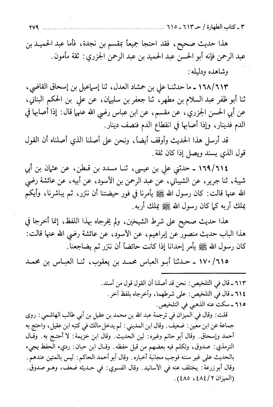 614 - حَدَّثَنِي عَلِيُّ بْنُ عِيسَى، ثنا مُسَدَّدُ بْنُ قَطَنٍ، عَنْ عُثْمَانَ بْنِ أَبِي شَيْبَةَ، ثنا جَرِيرٌ، عَنِ الشَّيْبَانِيِّ، عَنْ عَبْدِ الرَّحْمَنِ بْنِ الْأَسْوَدِ، عَنْ أَبِيهِ، عَنْ عَائِشَةَ رَضِيَ اللَّهُ عَنْهَا، قَالَتْ: كَانَ رَسُولُ اللَّهِ صَلَّى اللهُ عَلَيْهِ وَسَلَّمَ «§يَأْمُرُنَا فِي فَوْرِ حَيْضَتِنَا أَنْ نَتَّزِرَ ثُمَّ يُبَاشِرَنَا، وَأَيُّكُمْ يَمْلِكُ إِرْبَهُ، كَمَا كَانَ رَسُولُ اللَّهِ صَلَّى اللهُ عَلَيْهِ وَسَلَّمَ يَمْلِكُ إِرْبَهُ؟» . «هَذَا حَدِيثٌ صَحِيحٌ عَلَى شَرْطِ الشَّيْخَيْنِ وَلَمْ يُخَرِّجَاهُ بِهَذَا اللَّفْظِ، إِنَّمَا أَخْرَجَا فِي هَذَا الْبَابِ» حَدِيثَ مَنْصُورٍ، عَنْ إِبْرَاهِيمَ، عَنِ الْأَسْوَدِ، عَنْ عَائِشَةَ رَضِيَ اللَّهُ عَنْهَا قَالَتْ: «كَانَ رَسُولُ اللَّهِ صَلَّى اللهُ عَلَيْهِ وَسَلَّمَ يَأْمُرُ إِحْدَانَا إِذَا كَانَتْ حَائِضًا أَنْ نَتَّزِرَ، ثُمَّ يُضَاجِعُنَا» K614 - على شرطهما