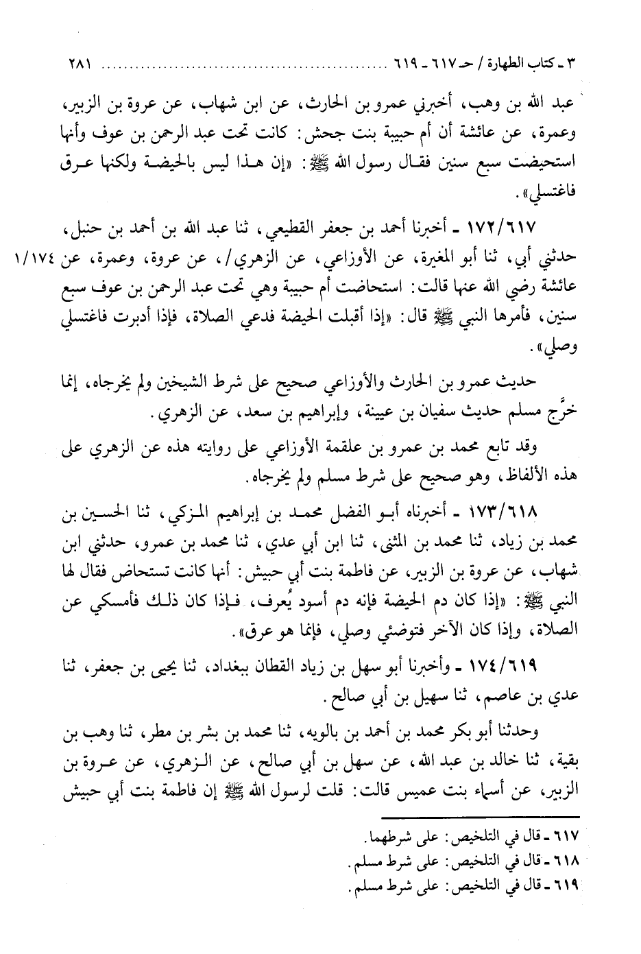 617 - أَخْبَرَنَا أَحْمَدُ بْنُ جَعْفَرٍ الْقَطِيعِيُّ، ثنا عَبْدُ اللَّهِ بْنُ أَحْمَدَ بْنِ حَنْبَلٍ، حَدَّثَنِي أَبِي، ثنا أَبُو الْمُغِيرَةِ، عَنِ الْأَوْزَاعِيِّ، عَنِ الزُّهْرِيِّ، عَنْ عُرْوَةَ، وَعَمْرَةَ عَنْ عَائِشَةَ رَضِيَ اللَّهُ عَنْهَا، قَالَتْ: اسْتَحَاضَتْ أُمُّ حَبِيبَةَ وَهِيَ تَحْتَ عَبْدِ الرَّحْمَنِ بْنِ عَوْفٍ سَبْعَ سِنِينَ، فَأَمَرَهَا النَّبِيُّ صَلَّى اللهُ عَلَيْهِ وَسَلَّمَ، قَالَ: «§إِذَا أَقْبَلَتِ الْحَيْضَةُ فَدَعِي الصَّلَاةَ، فَإِذَا أَدْبَرَتْ فَاغْتَسِلِي وَصَلِّي» . «حَدِيثُ عَمْرِو بْنِ الْحَارِثِ وَالْأَوْزَاعِيِّ صَحِيحٌ عَلَى شَرْطِ الشَّيْخَيْنِ وَلَمْ يُخَرِّجَاهُ، إِنَّمَا خَرَّجَ مُسْلِمٌ حَدِيثَ سُفْيَانَ بْنِ عُيَيْنَةَ وَإِبْرَاهِيمَ بْنِ سَعْدٍ، عَنِ الزُّهْرِيِّ» . وَقَدْ تَابَعَ مُحَمَّدَ بْنَ عَمْرِو بْنِ عَلْقَمَةَ الْأَوْزَاعِيَّ عَلَى رِوَايَتِهِ هَذِهِ، عَنِ الزُّهْرِيِّ عَلَى هَذِهِ الْأَلْفَاظِ. «وَهُوَ صَحِيحٌ عَلَى شَرْطِ مُسْلِمٍ وَلَمْ يُخَرِّجَاهُ» K617 - على شرطهما