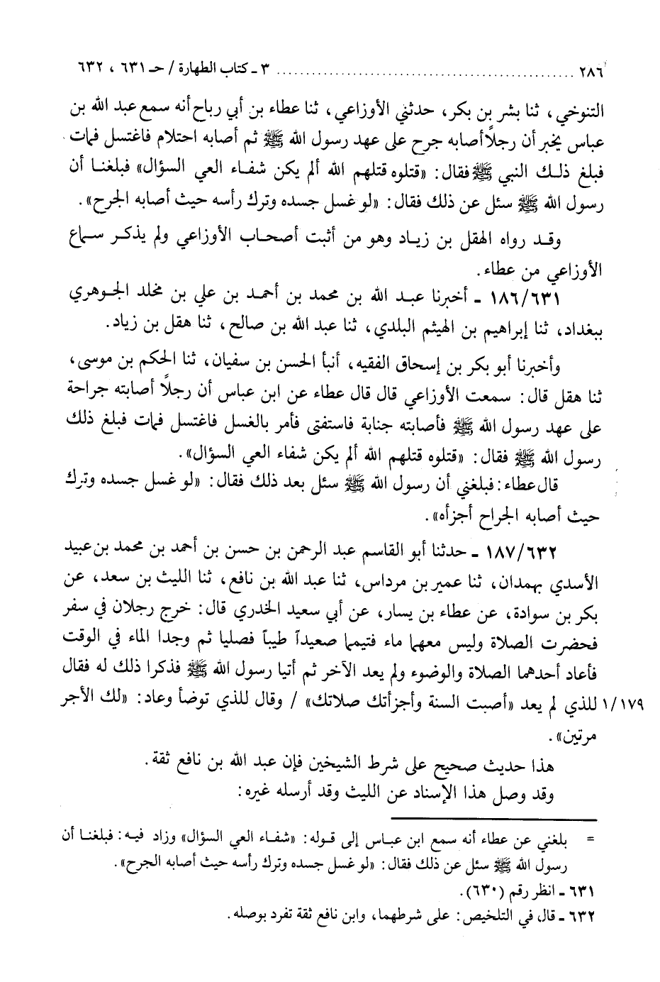 631 - أَخْبَرَنَا عَبْدُ اللَّهِ بْنُ مُحَمَّدِ بْنِ أَحْمَدَ بْنِ عَلِيِّ بْنِ مَخْلَدٍ الْجَوْهَرِيُّ، بِبَغْدَادَ، ثنا إِبْرَاهِيمُ بْنُ الْهَيْثَمِ الْبَلَدِيُّ، ثنا عَبْدُ اللَّهِ بْنُ صَالِحٍ، ثنا هِقْلُ بْنُ زِيَادٍ، وَأَخْبَرَنَا أَبُو بَكْرِ بْنُ إِسْحَاقَ الْفَقِيهُ، أَنْبَأَ الْحَسَنُ بْنُ سُفْيَانَ، ثنا الْحَكَمُ بْنُ مُوسَى، ثنا هِقْلٌ، قَالَ: سَمِعْتُ الْأَوْزَاعِيَّ، قَالَ: قَالَ عَطَاءٌ: عَنِ ابْنِ عَبَّاسٍ، أَنَّ رَجُلًا أَصَابَتْهُ جِرَاحَةٌ عَلَى عَهْدِ رَسُولِ اللَّهِ صَلَّى اللهُ عَلَيْهِ وَسَلَّمَ فَأَصَابَتْهُ جَنَابَةٌ فَاسْتَفْتَى فَأُمِرَ بِالْغُسْلِ فَاغْتَسَلَ فَمَاتَ، فَبَلَغَ ذَلِكَ رَسُولَ اللَّهِ صَلَّى اللهُ عَلَيْهِ وَسَلَّمَ، فَقَالَ: «§قَتَلُوهُ قَتَلَهُمُ اللَّهُ، أَلَمْ يَكُنْ شِفَاءُ الْعِيِّ السُّؤَالَ» قَالَ عَطَاءٌ: فَبَلَغَنِي أَنَّ رَسُولَ اللَّهِ صَلَّى اللهُ عَلَيْهِ وَسَلَّمَ سُئِلَ بَعْدَ ذَلِكَ، فَقَالَ: «لَوْ غَسَلَ جَسَدَهُ، وَتَرَكَ حَيْثُ أَصَابَهُ الْجِرَاحُ أَجْزَأَهُ»