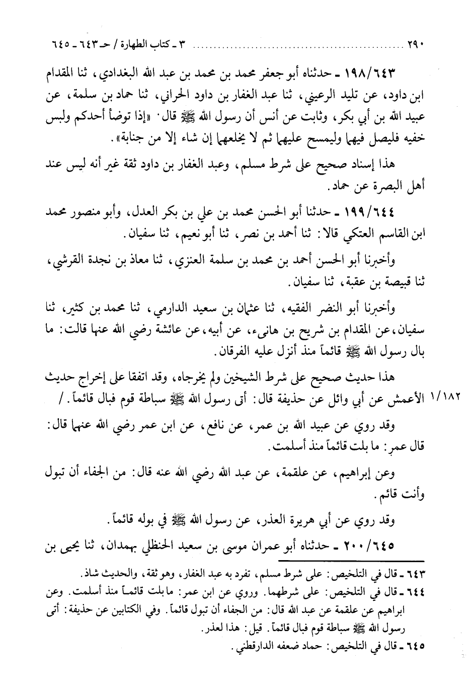 644 - حَدَّثَنَا أَبُو الْحَسَنِ مُحَمَّدُ بْنُ عَلِيِّ بْنِ بَكْرٍ الْعَدْلُ، وَأَبُو مَنْصُورٍ مُحَمَّدُ بْنُ الْقَاسِمِ الْعَتَكِيُّ، قَالَا: ثنا أَحْمَدُ بْنُ نَصْرٍ، ثنا أَبُو نُعَيْمٍ، ثنا سُفْيَانُ، وَأَخْبَرَنَا أَبُو الْحَسَنِ أَحْمَدُ بْنُ مُحَمَّدِ بْنِ سَلَمَةَ الْعَنَزِيُّ، ثنا مُعَاذُ بْنُ نَجْدَةَ الْقُرَشِيُّ، ثنا قَبِيصَةُ بْنُ عُقْبَةَ، ثنا سُفْيَانُ، وَأَخْبَرَنَا أَبُو النَّضْرِ الْفَقِيهُ، ثنا عُثْمَانُ بْنُ سَعِيدٍ الدَّارِمِيُّ، ثنا مُحَمَّدُ بْنُ كَثِيرٍ، ثنا سُفْيَانُ، عَنِ الْمِقْدَامِ بْنِ شُرَيْحِ بْنِ هَانِئٍ، عَنْ أَبِيهِ، عَنْ عَائِشَةَ رَضِيَ اللَّهُ عَنْهَا قَالَتْ: §«مَا بَالَ رَسُولُ اللَّهِ صَلَّى اللهُ عَلَيْهِ وَسَلَّمَ قَائِمًا مُنْذُ أُنْزِلَ عَلَيْهِ الْفُرْقَانُ» . «هَذَا حَدِيثٌ صَحِيحٌ عَلَى شَرْطِ الشَّيْخَيْنِ وَلَمْ يُخَرِّجَاهُ» وَقَدِ اتَّفَقَا عَلَى إِخْرَاجِ حَدِيثِ الْأَعْمَشِ، عَنْ أَبِي وَائِلٍ، عَنْ حُذَيْفَةَ، قَالَ: «أَتَى رَسُولُ اللَّهِ صَلَّى اللهُ عَلَيْهِ وَسَلَّمَ سُبَاطَةَ قَوْمٍ فَبَالَ قَائِمًا» وَقَدْ رُوِيَ عَنْ عُبَيْدِ اللَّهِ بْنِ عُمَرَ، عَنْ نَافِعٍ، عَنِ ابْنِ عُمَرَ رَضِيَ اللَّهُ عَنْهُمَا، قَالَ: قَالَ عُمَرُ: «مَا بُلْتُ قَائِمًا مُنْذُ أَسْلَمْتُ» وَعَنْ إِبْرَاهِيمَ، عَنْ عَلْقَمَةَ، عَنْ عَبْدِ اللَّهِ رَضِيَ اللَّهُ عَنْهُ، قَالَ: «مِنَ الْجَفَاءِ أَنْ تَبُولَ وَأَنْتَ قَائِمٌ» . وَقَدْ رُوِيَ، عَنْ أَبِي هُرَيْرَةَ الْعُذْرَ عَنْ رَسُولِ اللَّهِ صَلَّى اللهُ عَلَيْهِ وَسَلَّمَ فِي بَوْلِهِ قَائِمًا