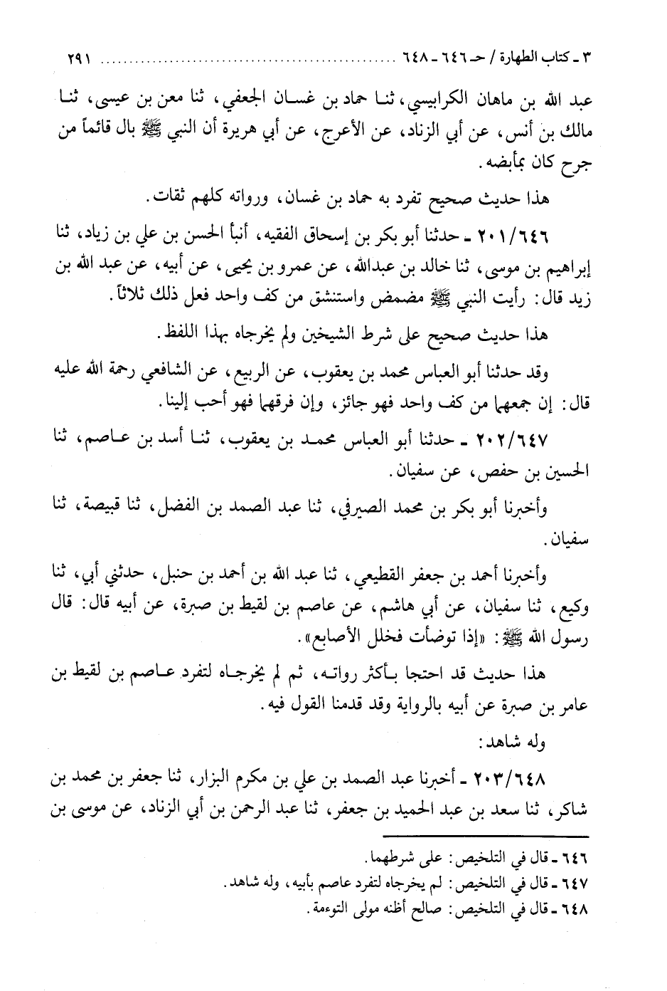 647 - حَدَّثَنَا أَبُو الْعَبَّاسِ مُحَمَّدُ بْنُ يَعْقُوبَ، ثنا أَسَدُ بْنُ عَاصِمٍ، ثنا الْحُسَيْنُ بْنُ حَفْصٍ، عَنْ سُفْيَانَ، وَأَخْبَرَنَا أَبُو بَكْرِ بْنُ مُحَمَّدٍ الصَّيْرَفِيُّ، ثنا عَبْدُ الصَّمَدِ بْنُ الْفَضْلِ، ثنا قَبِيصَةُ، ثنا سُفْيَانُ، وَأَخْبَرَنَا أَحْمَدُ بْنُ جَعْفَرٍ الْقَطِيعِيُّ، ثنا عَبْدُ اللَّهِ بْنُ أَحْمَدَ بْنِ حَنْبَلٍ، حَدَّثَنِي أَبِي، ثنا وَكِيعٌ، ثنا سُفْيَانُ، عَنْ أَبِي هَاشِمٍ، عَنْ عَاصِمِ بْنِ لَقِيطِ بْنِ صَبِرَةَ، عَنْ أَبِيهِ، قَالَ: قَالَ رَسُولُ اللَّهِ صَلَّى اللهُ عَلَيْهِ وَسَلَّمَ: §«إِذَا تَوَضَّأْتَ فَخَلِّلِ الْأَصَابِعَ» . «هَذَا حَدِيثٌ قَدِ احْتَجَّا بِأَكْثَرِ رُوَاتِهِ ثُمَّ لَمْ يُخَرِّجَاهُ لِتَفَرُّدِ عَاصِمِ بْنِ لَقِيطِ بْنِ عَامِرِ بْنِ صَبِرَةَ، عَنْ أَبِيهِ بِالرِّوَايَةِ، وَقَدْ قَدَّمْنَا الْقَوْلَ فِيهِ وَلَهُ شَاهِدٌ» K647 - لم يخرجاه لتفرد عاصم بأبيه وله شاهد
