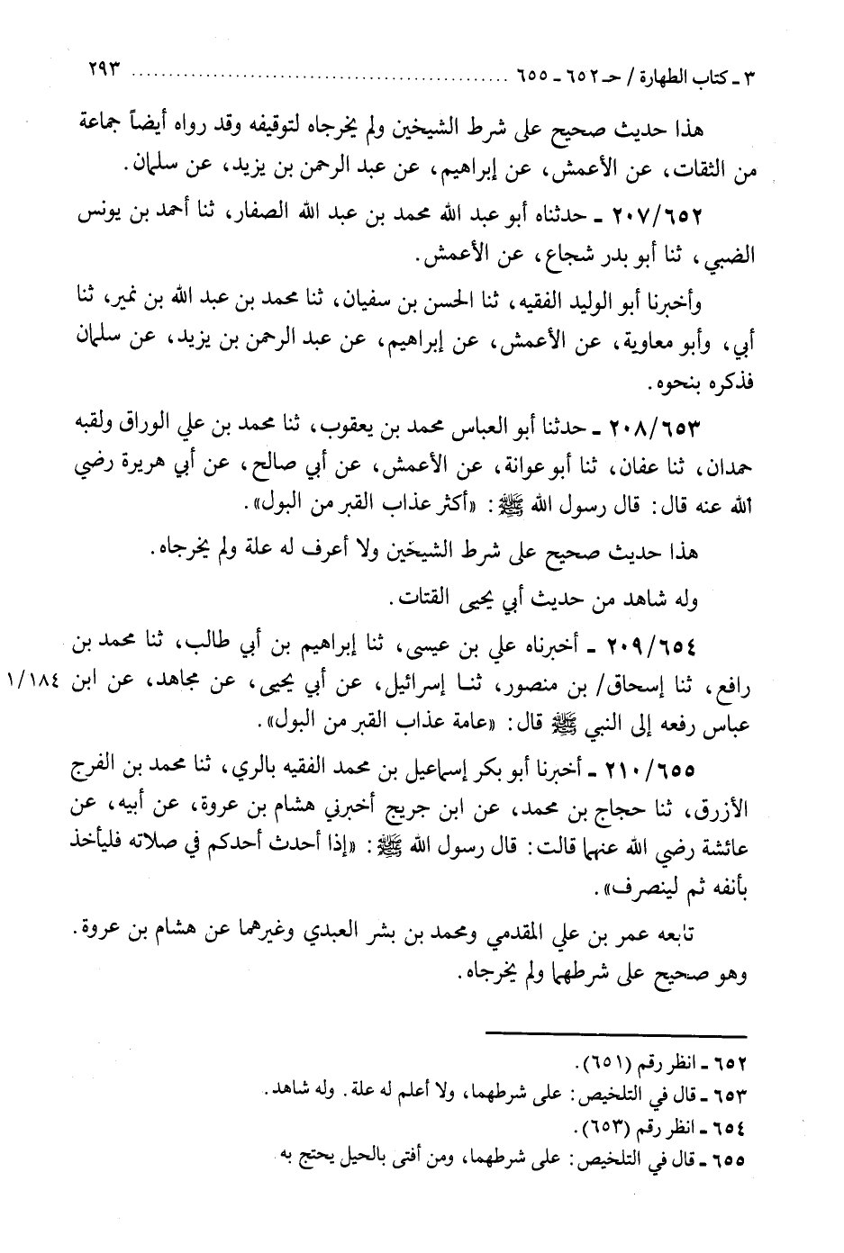 653 - حَدَّثَنَا أَبُو الْعَبَّاسِ مُحَمَّدُ بْنُ يَعْقُوبَ، ثنا مُحَمَّدُ بْنُ عَلِيٍّ الْوَرَّاقُ وَلَقَبُهُ حَمْدَانُ، ثنا عَفَّانُ، ثنا أَبُو عَوَانَةَ، عَنِ الْأَعْمَشِ، عَنْ أَبِي صَالِحٍ، عَنْ أَبِي هُرَيْرَةَ رَضِيَ اللَّهُ عَنْهُ، قَالَ: قَالَ رَسُولُ اللَّهِ صَلَّى اللهُ عَلَيْهِ وَسَلَّمَ: §«أَكْثَرُ عَذَابِ الْقَبْرِ مِنَ الْبَوْلِ» . «هَذَا حَدِيثٌ صَحِيحٌ عَلَى شَرْطِ الشَّيْخَيْنِ وَلَا أَعْرِفُ لَهُ عِلَّةً وَلَمْ يُخَرِّجَاهُ، وَلَهُ شَاهِدٌ مِنْ حَدِيثِ أَبِي يَحْيَى الْقَتَّاتِ» K653 - على شرطهما ولا أعلم له علة وله شاهد