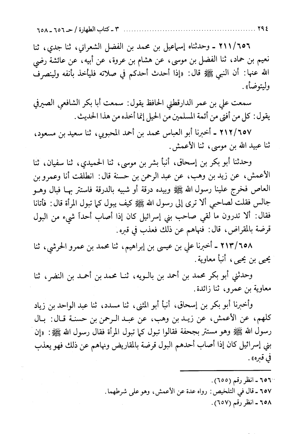 658 - أَخْبَرَنَا عَلِيُّ بْنُ عِيسَى بْنِ إِبْرَاهِيمَ، ثنا مُحَمَّدُ بْنُ عَمْرٍو الْحَرَشِيُّ، ثنا يَحْيَى بْنُ يَحْيَى، أَنْبَأَ مُعَاوِيَةُ، وَحَدَّثَنِي أَبُو بَكْرٍ مُحَمَّدُ بْنُ أَحْمَدَ بْنِ بَالَوَيْهِ، ثنا مُحَمَّدُ بْنُ أَحْمَدَ بْنِ النَّضْرِ، ثنا مُعَاوِيَةُ بْنُ عَمْرٍو، ثنا زَائِدَةُ، وَأَخْبَرَنَا أَبُو بَكْرِ بْنُ إِسْحَاقَ، أَنْبَأَ أَبُو الْمُثَنَّى، ثنا مُسَدَّدٌ، ثنا عَبْدُ الْوَاحِدِ بْنُ زِيَادٍ، كُلُّهُمْ، عَنِ الْأَعْمَشِ، عَنْ زَيْدِ بْنِ وَهْبٍ، عَنْ عَبْدِ الرَّحْمَنِ بْنِ حَسَنَةَ، قَالَ: بَالَ رَسُولُ اللَّهِ صَلَّى اللهُ عَلَيْهِ وَسَلَّمَ وَهُوَ مُسْتَتِرٌ بِجُحْفَةٍ فَقَالُوا: تَبُولُ كَمَا تَبُولُ الْمَرْأَةُ؟ فَقَالَ رَسُولُ اللَّهِ صَلَّى اللهُ عَلَيْهِ وَسَلَّمَ: «إِنَّ بَنِي إِسْرَائِيلَ كَانَ §إِذَا أَصَابَ أَحَدَهُمُ الْبَوْلُ قَرَضَهُ بِالْمَقَارِيضِ وَنَهَاهُمْ عَنْ ذَلِكَ فَهُوَ يُعَذَّبُ فِي قَبْرِهِ» . «هَذَا حَدِيثٌ صَحِيحُ الْإِسْنَادِ وَمِنْ شَرْطِ الشَّيْخَيْنِ إِلَى أَنْ يَبْلُغَ. تَفَرَّدَ زَيْدُ بْنُ وَهْبٍ بِالرِّوَايَةِ عَنْ عَبْدِ الرَّحْمَنِ بْنِ حَسَنَةَ، وَلَمْ يُخَرِّجَاهُ بِهَذَا اللَّفْظِ»