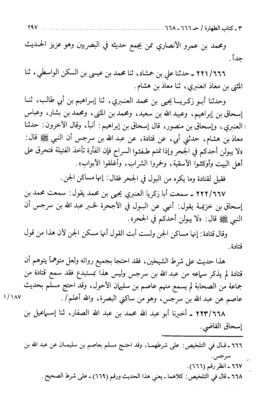 666 - حَدَّثَنَا عَلِيُّ بْنُ حَمْشَاذٍ، ثنا مُحَمَّدُ بْنُ عِيسَى بْنِ السَّكَنِ الْوَاسِطِيُّ، ثنا الْمُثَنَّى بْنُ مُعَاذٍ الْعَنْبَرِيُّ، ثنا مُعَاذُ بْنُ هِشَامٍ، وَحَدَّثَنَا أَبُو زَكَرِيَّا يَحْيَى بْنُ مُحَمَّدٍ الْعَنْبَرِيُّ، ثنا إِبْرَاهِيمُ بْنُ أَبِي طَالِبٍ، ثنا إِسْحَاقُ بْنُ إِبْرَاهِيمَ، وَعُبَيْدُ اللَّهِ بْنُ سَعِيدٍ، وَمُحَمَّدُ بْنُ الْمُثَنَّى، وَمُحَمَّدُ بْنُ بَشَّارٍ، وَعَبَّاسٌ الْعَنْبَرِيُّ، وَإِسْحَاقُ بْنُ مَنْصُورٍ - قَالَ إِسْحَاقُ بْنُ إِبْرَاهِيمَ: أَنْبَأَ وَقَالَ الْآخَرُونَ: حَدَّثَنَا - مُعَاذُ بْنُ هِشَامٍ، حَدَّثَنِي أَبِي، عَنْ قَتَادَةَ، عَنْ عَبْدِ اللَّهِ بْنِ سَرْجِسَ، أَنَّ النَّبِيَّ صَلَّى اللهُ عَلَيْهِ وَسَلَّمَ، قَالَ: §«لَا يَبُولَنَّ أَحَدُكُمْ فِي الْجُحْرِ» K666 - على شرطهما