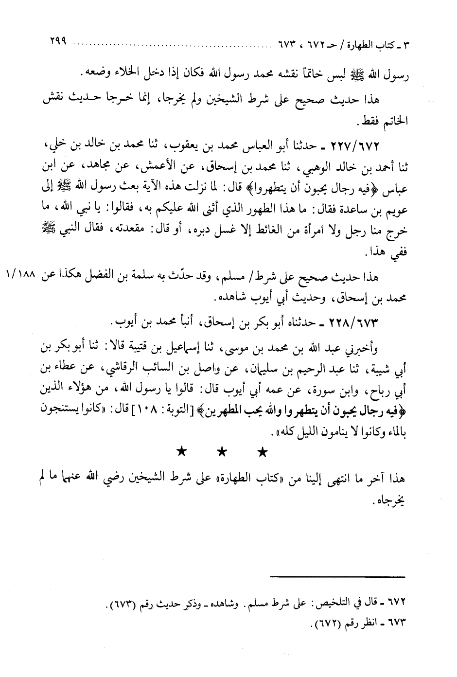673 - حَدَّثَنَاهُ أَبُو بَكْرِ بْنُ إِسْحَاقَ، أَنْبَأَ مُحَمَّدُ بْنُ أَيُّوبَ، وَأَخْبَرَنِي عَبْدُ اللَّهِ بْنُ مُحَمَّدِ بْنِ مُوسَى، ثنا إِسْمَاعِيلُ بْنُ قُتَيْبَةَ، قَالَا: ثنا أَبُو بَكْرِ بْنُ أَبِي شَيْبَةَ، ثنا عَبْدُ الرَّحِيمِ بْنُ سُلَيْمَانَ، عَنْ وَاصِلِ بْنِ السَّائِبِ الرَّقَاشِيِّ، عَنْ عَطَاءِ بْنِ أَبِي رَبَاحٍ، وَابْنِ سَوْرَةَ، عَنْ عَمِّهِ أَبِي أَيُّوبَ، قَالَ: قَالُوا: يَا رَسُولَ اللَّهِ مَنْ هَؤُلَاءِ الَّذِينَ {فِيهِ رِجَالٌ يُحِبُّونَ أَنْ يَتَطَهَّرُوا وَاللَّهُ يُحِبُّ الْمُطَّهِّرِينَ} [التوبة: 108] قَالَ: «§كَانُوا يَسْتَنْجُونَ بِالْمَاءِ، وَكَانُوا لَا يَنَامُونَ اللَّيْلَ كُلَّهُ» هَذَا آخِرُ مَا انْتَهَى إِلَيْنَا مِنْ «كِتَابِ الطَّهَارَةِ» عَلَى شَرْطِ الشَّيْخَيْنِ رَضِيَ اللَّهُ عَنْهُمَا مَا لَمْ يُخَرِّجَاهُ