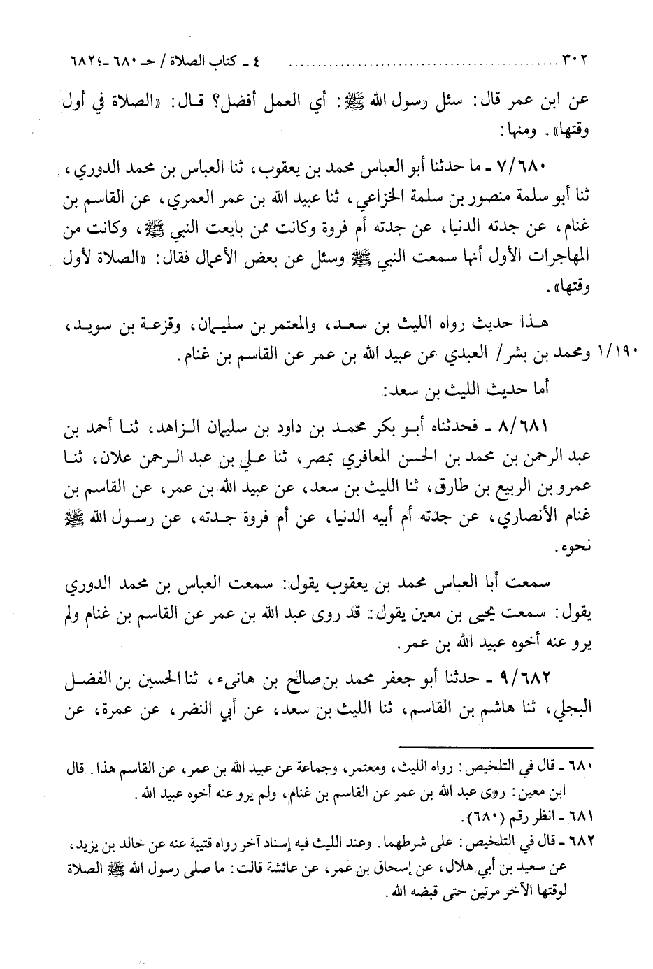 682 - حَدَّثَنَا أَبُو جَعْفَرٍ مُحَمَّدُ بْنُ صَالِحِ بْنِ هَانِئٍ، ثنا الْحُسَيْنُ بْنُ الْفَضْلِ الْبَجَلِيُّ، ثنا هَاشِمُ بْنُ الْقَاسِمِ، ثنا اللَّيْثُ بْنُ سَعْدٍ، عَنْ أَبِي النَّضْرِ، عَنْ عَمْرَةَ، عَنْ عَائِشَةَ رَضِيَ اللَّهُ عَنْهَا، قَالَتْ: §«مَا صَلَّى رَسُولُ اللَّهِ صَلَّى اللهُ عَلَيْهِ وَسَلَّمَ الصَّلَاةَ لِوَقْتِهَا الْآخِرِ حَتَّى قَبَضَهُ اللَّهُ» . «هَذَا حَدِيثٌ صَحِيحٌ عَلَى شَرْطِ الشَّيْخَيْنِ، وَعِنْدَ اللَّيْثِ فِيهِ إِسْنَادٌ آخَرُ» K682 - على شرطهما