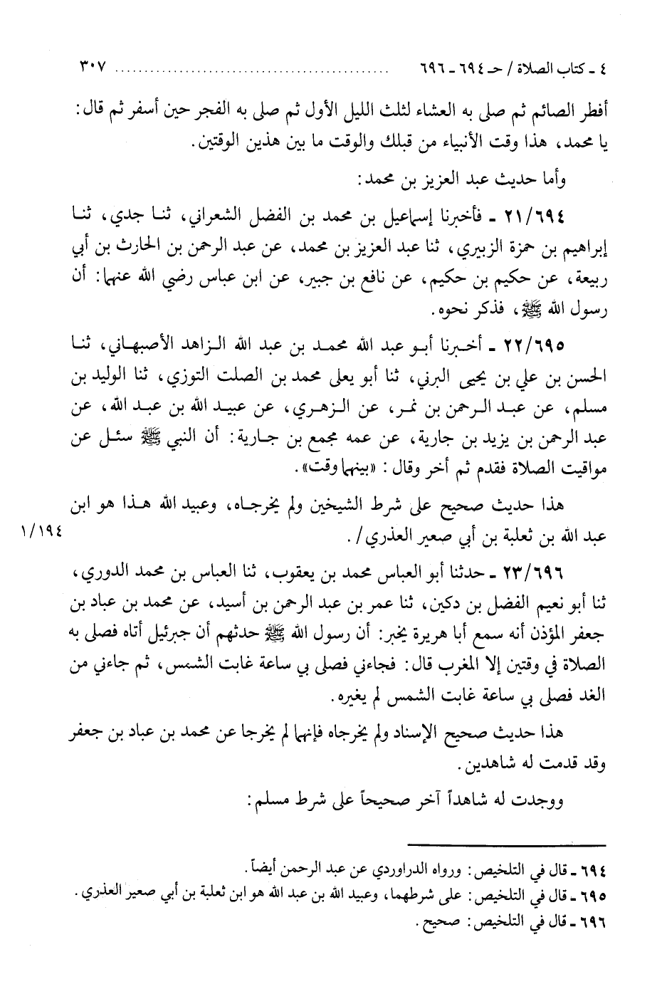 696 - حَدَّثَنَا أَبُو الْعَبَّاسِ مُحَمَّدُ بْنُ يَعْقُوبَ، ثنا الْعَبَّاسُ بْنُ مُحَمَّدٍ الدُّورِيُّ، ثنا أَبُو نُعَيْمٍ الْفَضْلُ بْنُ دُكَيْنٍ، ثنا عُمَرُ بْنُ عَبْدِ الرَّحْمَنِ بْنِ أُسَيْدٍ، عَنْ مُحَمَّدِ بْنِ عَبَّادِ بْنِ جَعْفَرٍ الْمُؤَذِّنِ، أَنَّهُ سَمِعَ أَبَا هُرَيْرَةَ، يُخْبِرُ أَنَّ رَسُولَ اللَّهِ صَلَّى اللهُ عَلَيْهِ وَسَلَّمَ حَدَّثَهُمْ «أَنَّ §جِبْرِيلَ أَتَاهُ فَصَلَّى بِهِ الصَّلَاةَ فِي وَقْتَيْنِ إِلَّا الْمَغْرِبَ» ، قَالَ: «فَجَاءَنِي فَصَلَّى بِي سَاعَةَ غَابَتِ الشَّمْسُ، ثُمَّ جَاءَنِي مِنَ الْغَدِ فَصَلَّى بِي سَاعَةَ غَابَتِ الشَّمْسُ لَمْ يُغَيِّرَهُ» . «هَذَا حَدِيثٌ صَحِيحُ الْإِسْنَادِ وَلَمْ يُخَرِّجَاهُ فَإِنَّهُمَا لَمْ يُخَرِّجَا عَنْ مُحَمَّدِ بْنِ عَبَّادِ بْنِ جَعْفَرٍ، وَقَدْ قَدَّمْتُ لَهُ شَاهِدَيْنِ وَوَجَدْتُ لَهُ شَاهِدًا آخَرَ صَحِيحًا عَلَى شَرْطِ مُسْلِمٍ» K696 - صحيح