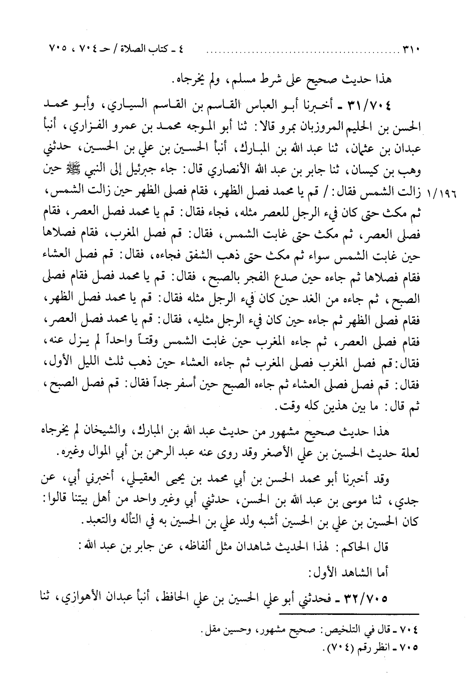 704 - أَخْبَرَنَا أَبُو الْعَبَّاسِ الْقَاسِمُ بْنُ الْقَاسِمِ السَّيَّارِيُّ، وَأَبُو مُحَمَّدٍ الْحَسَنُ بْنُ الْحَلِيمِ الْمَرْوَزِيَّانِ بِمَرْوَ، قَالَا: ثنا أَبُو الْمُوَجِّهِ مُحَمَّدُ بْنُ عَمْرٍو الْفَزَارِيُّ، أَنْبَأَ عَبْدَانُ بْنُ عُثْمَانَ، ثنا عَبْدُ اللَّهِ بْنُ الْمُبَارَكِ، أَنْبَأَ الْحُسَيْنُ بْنُ عَلِيِّ بْنِ الْحُسَيْنِ، حَدَّثَنِي وَهْبُ بْنُ كَيْسَانَ، ثنا جَابِرُ بْنُ عَبْدِ اللَّهِ الْأَنْصَارِيُّ، قَالَ: §" جَاءَ جِبْرِيلُ إِلَى النَّبِيِّ صَلَّى اللهُ عَلَيْهِ وَسَلَّمَ حِينَ زَالَتِ الشَّمْسُ، فَقَالَ: قُمْ يَا مُحَمَّدُ فَصَلِّ الظُّهْرَ، فَقَامَ فَصَلَّى الظُّهْرَ حِينَ زَالَتِ الشَّمْسُ، ثُمَّ مَكَثَ حَتَّى كَانَ فَيْءُ الرَّجُلِ لِلْعَصْرِ مِثْلَهُ، فَجَاءَ فَقَالَ: قُمْ يَا مُحَمَّدُ فَصَلِّ الْعَصْرَ، فَقَامَ فَصَلَّى الْعَصْرَ، ثُمَّ مَكَثَ حَتَّى غَابَتِ الشَّمْسُ، فَقَالَ: قُمْ فَصَلِّ الْمَغْرِبَ فَقَامَ فَصَلَّاهَا حِينَ غَابَتِ الشَّمْسُ سَوَاءٌ، ثُمَّ مَكَثَ حَتَّى ذَهَبَ الشَّفَقُ فَجَاءَهُ، فَقَالَ: قُمْ فَصَلِّ الْعِشَاءَ فَقَامَ فَصَلَّاهَا، ثُمَّ جَاءَهُ حِينَ صَدَعَ الْفَجْرُ بِالصُّبْحِ، فَقَالَ: قُمْ يَا مُحَمَّدُ فَصَلِّ، فَقَامَ فَصَلَّى الصُّبْحَ، ثُمَّ جَاءَهُ مِنَ الْغَدِ حِينَ كَانَ فَيْءُ الرَّجُلِ مِثْلَهُ، فَقَالَ: قُمْ يَا مُحَمَّدُ فَصَلِّ الظُّهْرَ، فَقَامَ فَصَلَّى الظُّهْرَ ثُمَّ جَاءَهُ حِينَ كَانَ فَيْءُ الرَّجُلِ مِثْلَيْهِ، فَقَالَ: قُمْ يَا مُحَمَّدُ فَصَلِّ الْعَصْرَ، فَقَامَ فَصَلَّى الْعَصْرَ ثُمَّ جَاءَهُ الْمَغْرِبَ حِينَ غَابَتِ الشَّمْسُ وَقْتًا وَاحِدًا لَمْ يَزُلْ عَنْهُ، فَقَالَ: قُمْ فَصَلِّ الْمَغْرِبَ فَصَلَّى الْمَغْرِبَ، ثُمَّ جَاءَهُ الْعِشَاءَ حِينَ ذَهَبَ ثُلُثُ اللَّيْلِ الْأَوَّلُ، فَقَالَ: قُمْ فَصَلِّ فَصَلَّى الْعِشَاءَ ثُمَّ جَاءَهُ الصُّبْحَ حِينَ أَسْفَرَ جِدًّا، فَقَالَ: قُمْ فَصَلِّ الصُّبْحَ ثُمَّ، قَالَ: مَا بَيْنَ هَذَيْنِ كُلُّهُ وَقْتٌ «.» هَذَا حَدِيثٌ صَحِيحٌ مَشْهُورٌ مِنْ حَدِيثِ عَبْدِ اللَّهِ بْنِ الْمُبَارَكِ، وَالشَّيْخَانِ لَمْ يُخَرِّجَاهُ لِعِلَّةِ حَدِيثِ الْحُسَيْنِ بْنِ عَلِيٍّ الْأَصْغَرِ، وَقَدْ رَوَى عَنْهُ عَبْدُ الرَّحْمَنِ بْنُ أَبِي الْمَوَالِ وَغَيْرُهُ ". وَقَدْ أَخْبَرَنَا أَبُو مُحَمَّدٍ الْحَسَنُ بْنُ أَبِي مُحَمَّدِ بْنِ يَحْيَى الْعُقَيْلِيُّ، أَخْبَرَنِي أَبِي، عَنْ جَدِّي ثنا مُوسَى بْنُ عَبْدِ اللَّهِ بْنِ الْحَسَنِ، حَدَّثَنِي أَبِي وَغَيْرُ وَاحِدٍ مِنْ أَهْلِ بَيْتِنَا، قَالُوا: «كَانَ الْحُسَيْنُ بْنُ عَلِيِّ بْنِ الْحُسَيْنِ أَشْبَهُ وَلَدِ عَلِيِّ بْنِ الْحُسَيْنِ بِهِ فِي التَّأَلُّهِ وَالتَّعَبُّدِ» . قَالَ الْحَاكِمُ: «لِهَذَا الْحَدِيثِ شَاهِدَانِ مِثْلُ أَلْفَاظِهِ عَنْ جَابِرِ بْنِ عَبْدِ اللَّهِ، أَمَّا الشَّاهِدُ الْأَوَّلُ» .