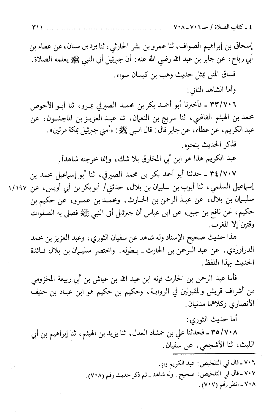 707 - حَدَّثَنَا أَبُو أَحْمَدَ بَكْرُ بْنُ مُحَمَّدٍ الصَّيْرَفِيُّ، ثنا أَبُو إِسْمَاعِيلَ مُحَمَّدُ بْنُ إِسْمَاعِيلَ السُّلَمِيُّ، ثنا أَيُّوبُ بْنُ سُلَيْمَانَ بْنِ بِلَالٍ، حَدَّثَنِي أَبُو بَكْرِ بْنُ أَبِي أُوَيْسٍ، عَنْ سُلَيْمَانَ بْنِ بِلَالٍ، عَنْ عَبْدِ الرَّحْمَنِ بْنِ الْحَارِثِ، وَمُحَمَّدِ بْنِ عَمْرٍو، عَنْ حَكِيمِ بْنِ حَكِيمٍ، عَنْ نَافِعِ بْنِ جُبَيْرٍ، عَنِ ابْنِ عَبَّاسٍ، «أَنَّ §جِبْرِيلَ أَتَى النَّبِيَّ صَلَّى اللهُ عَلَيْهِ وَسَلَّمَ فَصَلَّى بِهِ الصَّلَوَاتِ وَقْتَيْنِ، إِلَّا الْمَغْرِبَ» . «هَذَا حَدِيثٌ صَحِيحُ الْإِسْنَادِ وَلَهُ شَاهِدٌ عَنْ سُفْيَانَ الثَّوْرِيِّ وَعَبْدِ الْعَزِيزِ بْنِ مُحَمَّدٍ الدَّرَاوَرْدِيِّ، عَنْ عَبْدِ الرَّحْمَنِ بْنِ الْحَارِثِ بِطُولِهِ وَاخْتَصَرَ سُلَيْمَانُ بْنُ بِلَالٍ فَائِدَةَ الْحَدِيثِ بِهَذَا اللَّفْظِ، فَأَمَّا عَبْدُ الرَّحْمَنِ بْنُ الْحَارِثِ فَإِنَّهُ ابْنُ عَبْدِ اللَّهِ بْنِ عَيَّاشِ بْنِ أَبِي رَبِيعَةَ الْمَخْزُومِيُّ مِنْ أَشْرَافِ قُرَيْشٍ وَالْمَقْبُولِينَ فِي الرِّوَايَةِ، وَحَكِيمُ بْنُ حَكِيمٍ هُوَ ابْنُ عَبَّادِ بْنِ حُنَيْفٍ الْأَنْصَارِيُّ وَكِلَاهُمَا مَدَنِيَّانِ» K707 - صحيح