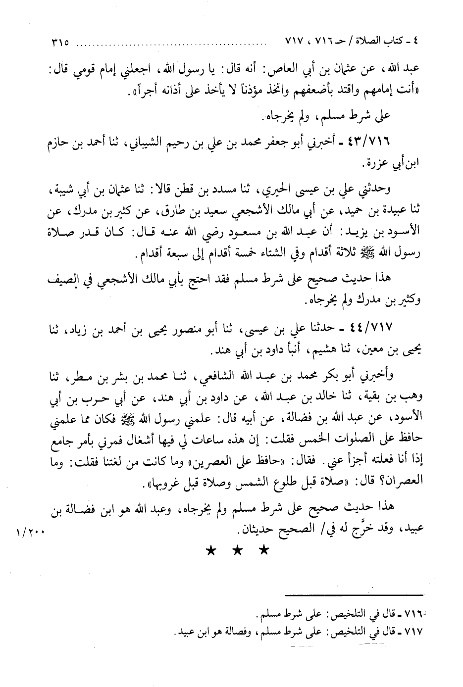 716 - أَخْبَرَنِي أَبُو جَعْفَرٍ مُحَمَّدُ بْنُ عَلِيِّ بْنِ دُحَيْمٍ الشَّيْبَانِيُّ، ثنا أَحْمَدُ بْنُ حَازِمِ بْنِ أَبِي غَرْزَةَ، وَحَدَّثَنِي عَلِيُّ بْنُ عِيسَى الْحِيرِيُّ، ثنا مُسَدَّدُ بْنُ قَطَنٍ، قَالَا: ثنا عُثْمَانُ بْنُ أَبِي شَيْبَةَ، ثنا عَبِيدَةُ بْنُ حُمَيْدٍ، عَنْ أَبِي مَالِكٍ الْأَشْجَعِيِّ سَعِيدِ بْنِ طَارِقٍ، عَنْ كَثِيرِ بْنِ مُدْرِكٍ، عَنِ الْأَسْوَدِ بْنِ يَزِيدَ، أَنَّ عَبْدَ اللَّهِ بْنَ مَسْعُودٍ رَضِيَ اللَّهُ عَنْهُ، قَالَ: «كَانَ §قَدْرُ صَلَاةِ رَسُولِ اللَّهِ صَلَّى اللهُ عَلَيْهِ وَسَلَّمَ ثَلَاثَةَ أَقْدَامٍ، وَفِي الشِّتَاءِ خَمْسَةُ أَقْدَامٍ إِلَى سَبْعَةِ أَقْدَامٍ» . «هَذَا حَدِيثٌ صَحِيحٌ عَلَى شَرْطِ مُسْلِمٍ فَقَدِ احْتَجَّ بِأَبِي مَالِكٍ الْأَشْجَعِيِّ فِي الصَّيْفِ، وَكَثِيرِ بْنِ مُدْرِكٍ وَلَمْ يُخَرِّجَاهُ» K716 - على شرط مسلم