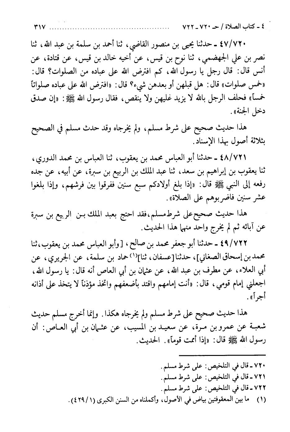 720 - حَدَّثَنَا يَحْيَى بْنُ مَنْصُورٍ الْقَاضِي، ثنا أَحْمَدُ بْنُ سَلَمَةَ بْنِ عَبْدِ اللَّهِ، ثنا نَصْرُ بْنُ عَلِيٍّ الْجَهْضَمِيُّ، ثنا نُوحُ بْنُ قَيْسٍ، عَنْ أَخِيهِ خَالِدِ بْنِ قَيْسٍ، عَنْ قَتَادَةَ، عَنْ أَنَسٍ، قَالَ: قَالَ رَجُلٌ: يَا رَسُولَ اللَّهِ، كَمِ افْتَرَضَ اللَّهُ عَلَى عِبَادِهِ مِنَ الصَّلَوَاتِ؟ قَالَ: «خَمْسَ صَلَوَاتٍ» قَالَ: هَلْ قَبْلَهُنَّ أَوْ بَعْدَهُنَّ شَيْءٌ؟ قَالَ: §«افْتَرَضَ اللَّهُ عَلَى عِبَادِهِ صَلَوَاتٍ خَمْسًا» فَحَلَفَ الرَّجُلُ بِاللَّهِ لَا يَزِيدُ عَلَيْهِنَّ وَلَا يَنْقُصُ، فَقَالَ رَسُولُ اللَّهِ صَلَّى اللهُ عَلَيْهِ وَسَلَّمَ: «إِنْ صَدَقَ دَخَلَ الْجَنَّةَ» . «هَذَا حَدِيثٌ صَحِيحٌ عَلَى شَرْطِ مُسْلِمٍ، وَلَمْ يُخَرِّجَاهُ، وَقَدْ حَدَّثَ مُسْلِمٌ فِي الصَّحِيحِ بِثَلَاثَةِ أُصُولٍ بِهَذَا الْإِسْنَادِ» K720 - على شرط مسلم