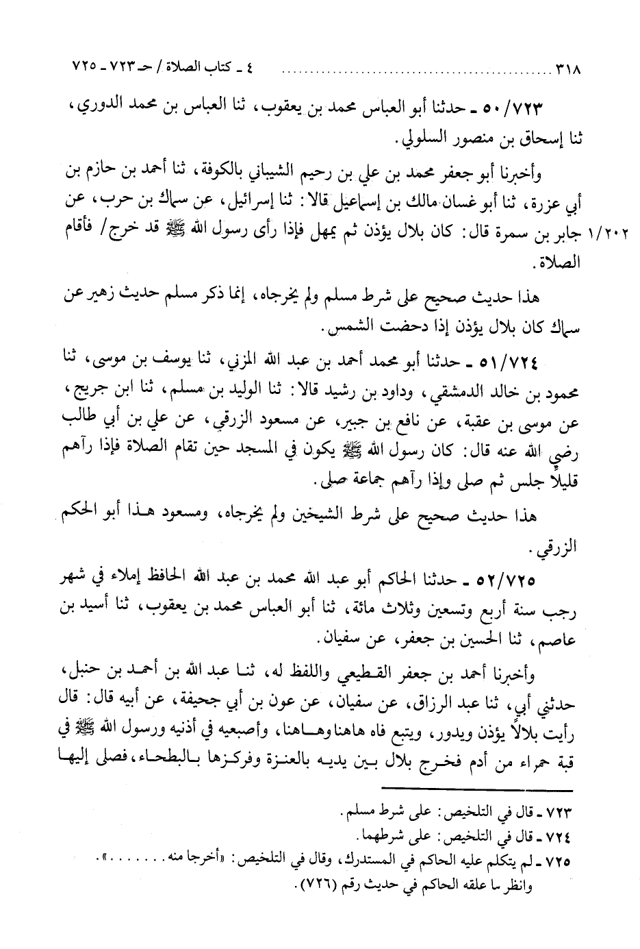 723 - حَدَّثَنَا أَبُو الْعَبَّاسِ مُحَمَّدُ بْنُ يَعْقُوبَ، ثنا الْعَبَّاسُ بْنُ مُحَمَّدٍ الدُّورِيُّ، ثنا إِسْحَاقُ بْنُ مَنْصُورٍ السَّلُولِيُّ، وَأَخْبَرَنَا أَبُو جَعْفَرٍ مُحَمَّدُ بْنُ عَلِيِّ بْنِ دُحَيْمٍ الشَّيْبَانِيُّ، بِالْكُوفَةِ، ثنا أَحْمَدُ بْنُ حَازِمِ بْنِ أَبِي غَرْزَةَ، ثنا أَبُو غَسَّانَ مَالِكُ بْنُ إِسْمَاعِيلَ، قَالَا: ثنا إِسْرَائِيلُ، عَنْ سِمَاكِ بْنِ حَرْبٍ، عَنْ جَابِرِ بْنِ سَمُرَةَ، قَالَ: «كَانَ §بِلَالٌ يُؤَذِّنُ ثُمَّ يُمْهِلُ، فَإِذَا رَأَى رَسُولَ اللَّهِ صَلَّى اللهُ عَلَيْهِ وَسَلَّمَ قَدْ خَرَجَ فَأَقَامَ الصَّلَاةَ» . " هَذَا حَدِيثٌ صَحِيحٌ عَلَى شَرْطِ مُسْلِمٍ، وَلَمْ يُخَرِّجَاهُ، إِنَّمَا ذَكَرَ مُسْلِمٌ حَدِيثَ زُهَيْرٍ، عَنْ سِمَاكِ: «كَانَ بِلَالٌ يُؤَذِّنُ إِذَا دَحَضَتِ الشَّمْسُ» K723 - على شرط مسلم