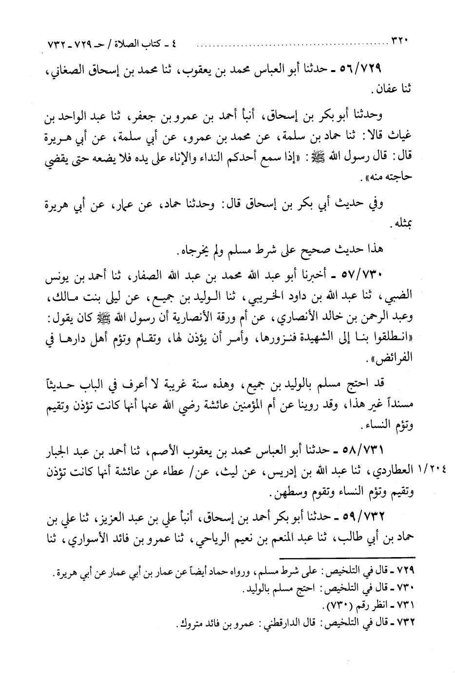 729 - حَدَّثَنَا أَبُو الْعَبَّاسِ مُحَمَّدُ بْنُ يَعْقُوبَ، ثنا مُحَمَّدُ بْنُ إِسْحَاقَ الصَّغَانِيُّ، ثنا عَفَّانُ، وَحَدَّثَنَا أَبُو بَكْرِ بْنُ إِسْحَاقَ، أَنْبَأَ أَحْمَدُ بْنُ عَمْرِو بْنِ جَعْفَرٍ، ثنا عَبْدُ الْوَاحِدِ بْنُ غِيَاثٍ، قَالَا: ثنا حَمَّادُ بْنُ سَلَمَةَ، عَنْ مُحَمَّدِ بْنِ عَمْرٍو، عَنْ أَبِي سَلَمَةَ، عَنْ أَبِي هُرَيْرَةَ، قَالَ: قَالَ رَسُولُ اللَّهِ صَلَّى اللهُ عَلَيْهِ وَسَلَّمَ: §«إِذَا سَمِعَ أَحَدُكُمُ النِّدَاءَ وَالْإِنَاءُ عَلَى يَدِهِ فَلَا يَضَعُهُ حَتَّى يَقْضِيَ حَاجَتَهُ مِنْهُ» . وَفِي حَدِيثِ أَبِي بَكْرِ بْنِ إِسْحَاقَ، قَالَ: وَحَدَّثَنَا حَمَّادٌ، عَنْ عَمَّارٍ، عَنْ أَبِي هُرَيْرَةَ بِمِثْلِهِ. «هَذَا حَدِيثٌ صَحِيحٌ عَلَى شَرْطِ مُسْلِمٍ وَلَمْ يُخَرِّجَاهُ» K729 - على شرط مسلم