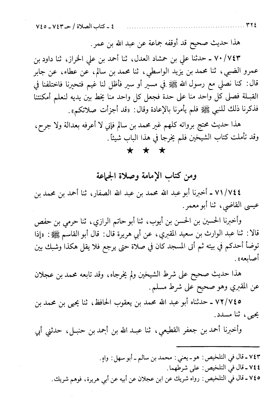 744 - أَخْبَرَنَا أَبُو عَبْدِ اللَّهِ مُحَمَّدُ بْنُ عَبْدِ اللَّهِ الصَّفَّارُ، ثنا أَحْمَدُ بْنُ مُحَمَّدِ بْنِ عِيسَى الْقَاضِي، ثنا أَبُو مَعْمَرٍ، وَأَخْبَرَنَا الْحُسَيْنُ بْنُ الْحَسَنِ بْنِ أَيُّوبَ، ثنا أَبُو حَاتِمٍ الرَّازِيُّ، ثنا حَرَمِيُّ بْنُ حَفْصٍ، قَالَا: ثنا عَبْدُ الْوَارِثِ بْنُ سَعِيدٍ الْمَقْبُرِيُّ، عَنْ أَبِي هُرَيْرَةَ، قَالَ: قَالَ أَبُو الْقَاسِمِ صَلَّى اللهُ عَلَيْهِ وَسَلَّمَ: §«إِذَا تَوَضَّأَ أَحَدُكُمْ فِي بَيْتِهِ ثُمَّ أَتَى الْمَسْجِدَ كَانَ فِي صَلَاةٍ حَتَّى يَرْجِعَ، فَلَا يَقُلْ هَكَذَا» وَشَبَّكَ بَيْنَ أَصَابِعِهِ. «هَذَا حَدِيثٌ صَحِيحٌ عَلَى شَرْطِ الشَّيْخَيْنِ وَلَمْ يُخَرِّجَاهُ» . وَقَدْ تَابَعَهُ مُحَمَّدُ بْنُ عَجْلَانَ عَنِ الْمَقْبُرِيِّ. وَهُوَ صَحِيحٌ عَلَى شَرْطِ مُسْلِمٍ "K744 - على شرطهما