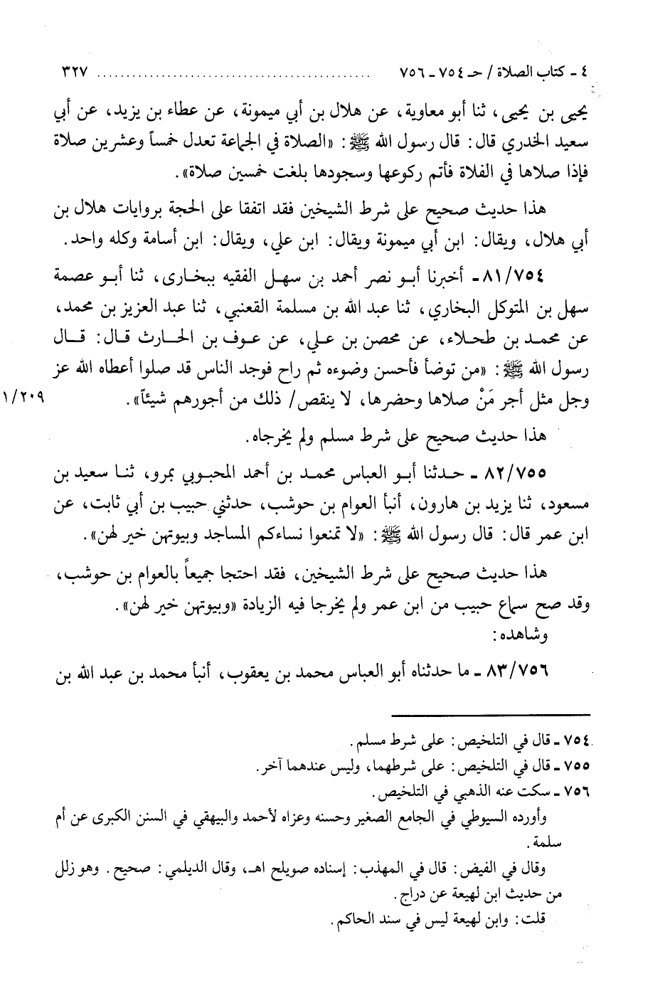 755 - حَدَّثَنَا أَبُو الْعَبَّاسِ مُحَمَّدُ بْنُ أَحْمَدَ الْمَحْبُوبِيُّ، بِمَرْوَ، ثنا سَعِيدُ بْنُ مَسْعُودٍ، ثنا يَزِيدُ بْنُ هَارُونَ، أَنْبَأَ الْعَوَّامُ بْنُ حَوْشَبٍ، حَدَّثَنِي حَبِيبُ بْنُ أَبِي ثَابِتٍ، عَنِ ابْنِ عُمَرَ، قَالَ: قَالَ رَسُولُ اللَّهِ صَلَّى اللهُ عَلَيْهِ وَسَلَّمَ: «§لَا تَمْنَعُوا نِسَاءَكُمُ الْمَسَاجِدَ، وَبُيُوتُهُنَّ خَيْرٌ لَهُنَّ» . «هَذَا حَدِيثٌ صَحِيحٌ عَلَى شَرْطِ الشَّيْخَيْنِ، فَقَدِ احْتَجَّا جَمِيعًا بِالْعَوَّامِ بْنِ حَوْشَبٍ، وَقَدْ صَحَّ سَمَاعُ حَبِيبٍ مِنِ ابْنِ عُمَرَ، وَلَمْ يُخَرِّجَا فِيهِ الزِّيَادَةَ» وَبُيُوتُهُنَّ خَيْرٌ لَهُنَّ «وَشَاهِدُهُ» K755 - على شرطهما