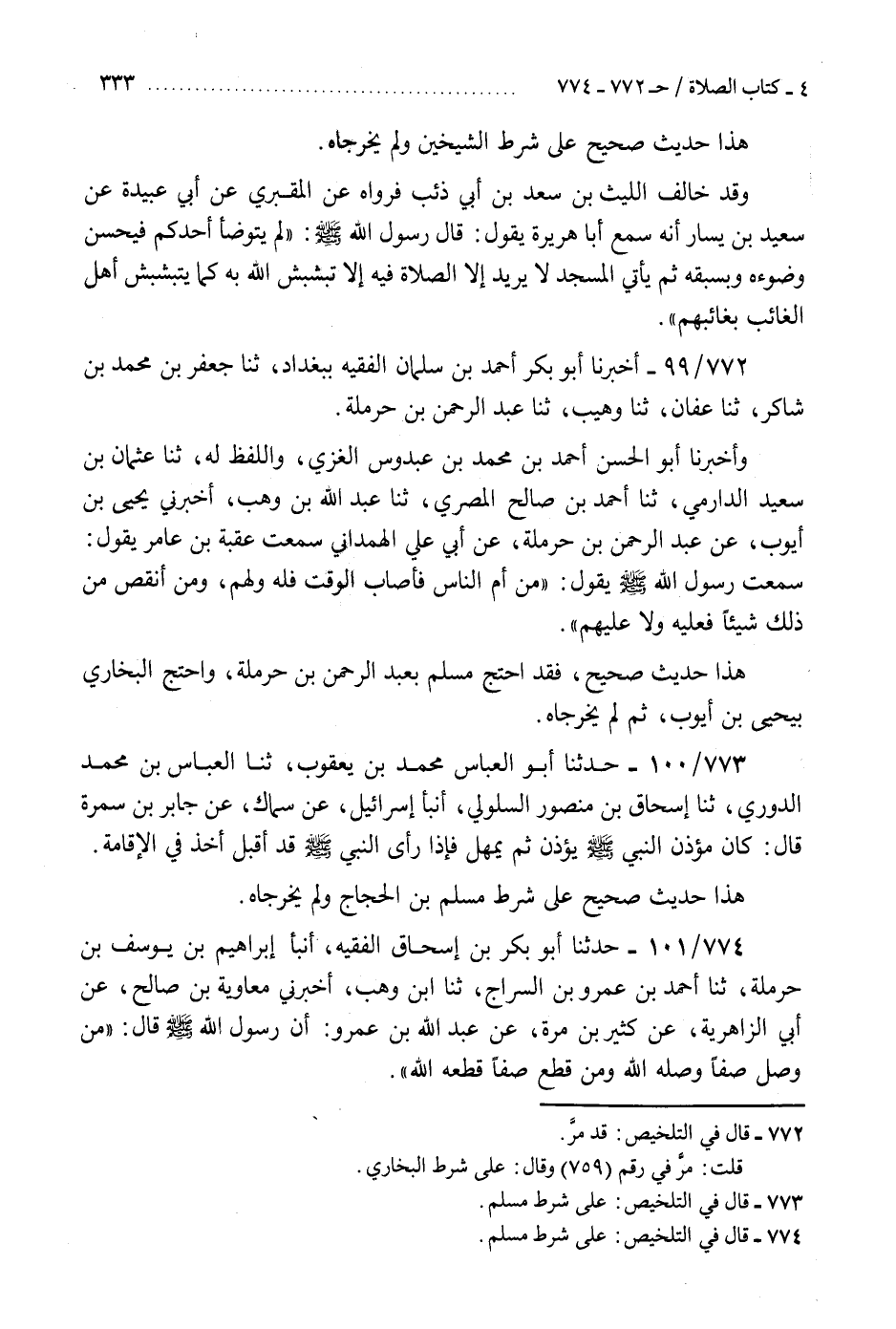 772 - أَخْبَرَنَا أَبُو بَكْرٍ أَحْمَدُ بْنُ سَلْمَانَ الْفَقِيهُ، بِبَغْدَادَ، ثنا جَعْفَرُ بْنُ مُحَمَّدِ بْنِ شَاكِرٍ، ثنا عَفَّانُ، ثنا وُهَيْبٌ، ثنا عَبْدُ الرَّحْمَنِ بْنُ حَرْمَلَةَ، وَأَخْبَرَنَا أَبُو الْحَسَنِ أَحْمَدُ بْنُ مُحَمَّدِ بْنِ عَبْدُوسٍ الْغَزِّيُّ وَاللَّفْظُ لَهُ، ثنا عُثْمَانُ بْنُ سَعِيدٍ الدَّارِمِيُّ، ثنا أَحْمَدُ بْنُ صَالِحٍ الْمِصْرِيُّ، ثنا عَبْدُ اللَّهِ بْنُ وَهْبٍ، أَخْبَرَنِي يَحْيَى بْنُ أَيُّوبَ، عَنْ عَبْدِ الرَّحْمَنِ بْنِ حَرْمَلَةَ، عَنْ أَبِي عَلِيٍّ الْهَمْدَانِيِّ، سَمِعْتُ عُقْبَةَ بْنَ عَامِرٍ، يَقُولُ: سَمِعْتُ رَسُولَ اللَّهِ صَلَّى اللهُ عَلَيْهِ وَسَلَّمَ، يَقُولُ: «§مَنْ أَمَّ النَّاسَ فَأَصَابَ الْوَقْتَ فَلَهُ وَلَهُمْ، وَمَنْ أَنْقَصَ مِنْ ذَلِكَ شَيْئًا فَعَلَيْهِ وَلَا عَلَيْهِمْ» . «هَذَا حَدِيثٌ صَحِيحٌ، فَقَدِ احْتَجَّ مُسْلِمٌ بِعَبْدِ الرَّحْمَنِ بْنِ حَرْمَلَةَ، وَاحْتَجَّ الْبُخَارِيُّ بِيَحْيَى بْنِ أَيُّوبَ، ثُمَّ لَمْ يُخَرِّجَاهُ»