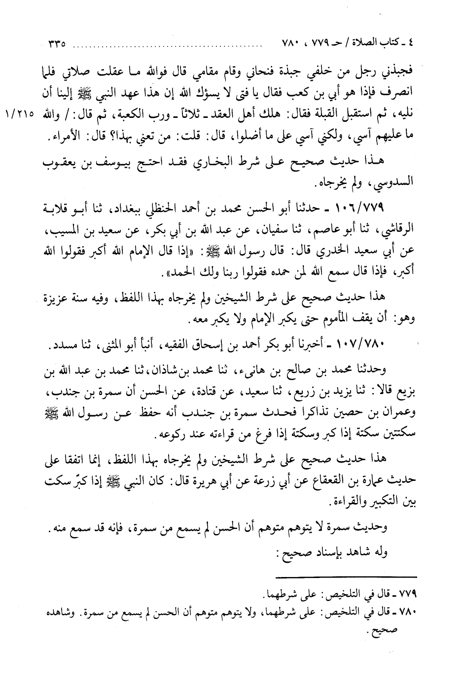 780 - أَخْبَرَنَا أَبُو بَكْرٍ أَحْمَدُ بْنُ إِسْحَاقَ الْفَقِيهُ، أَنْبَأَ أَبُو الْمُثَنَّى، ثنا مُسَدَّدٌ، وَحَدَّثَنَا مُحَمَّدُ بْنُ صَالِحِ بْنِ هَانِئٍ، ثنا مُحَمَّدُ بْنُ شَاذَانَ، ثنا مُحَمَّدُ بْنُ عَبْدِ اللَّهِ بْنِ بَزِيعٍ، قَالَا: ثنا يَزِيدُ بْنُ زُرَيْعٍ، ثنا سَعِيدٌ، عَنْ قَتَادَةَ، عَنِ الْحَسَنِ، أَنَّ سَمُرَةَ بْنَ جُنْدُبٍ، وَعِمْرَانَ بْنَ حُصَيْنٍ، تَذَاكَرَا فَحَدَّثَ سَمُرَةُ بْنُ جُنْدُبٍ، أَنَّهُ حَفِظَ عَنْ رَسُولِ اللَّهِ صَلَّى اللهُ عَلَيْهِ وَسَلَّمَ سَكْتَتَيْنِ: «§سَكْتَةً إِذَا كَبَّرَ، وَسَكْتَةً إِذَا فَرَغَ مِنْ قِرَاءَتِهِ عِنْدَ رُكُوعِهِ» . " هَذَا حَدِيثٌ صَحِيحٌ عَلَى شَرْطِ الشَّيْخَيْنِ وَلَمْ يُخَرِّجَاهُ بِهَذَا اللَّفْظِ، إِنَّمَا اتَّفَقَا عَلَى حَدِيثِ عُمَارَةَ بْنِ الْقَعْقَاعِ، عَنْ أَبِي زُرْعَةَ، عَنْ أَبِي هُرَيْرَةَ، قَالَ: كَانَ النَّبِيُّ صَلَّى اللهُ عَلَيْهِ وَسَلَّمَ إِذَا كَبَّرَ سَكَتَ بَيْنَ التَّكْبِيرِ وَالْقِرَاءَةِ، وَحَدِيثُ سَمُرَةَ لَا يَتَوَهَّمُ مُتَوَهِّمٌ أَنَّ الْحَسَنَ لَمْ يَسْمَعْ مِنْ سَمُرَةَ فَإِنَّهُ قَدْ سَمِعَ مِنْهُ وَلَهُ شَاهِدٌ بِإِسْنَادٍ صَحِيحٍ "K780 - على شرطهما