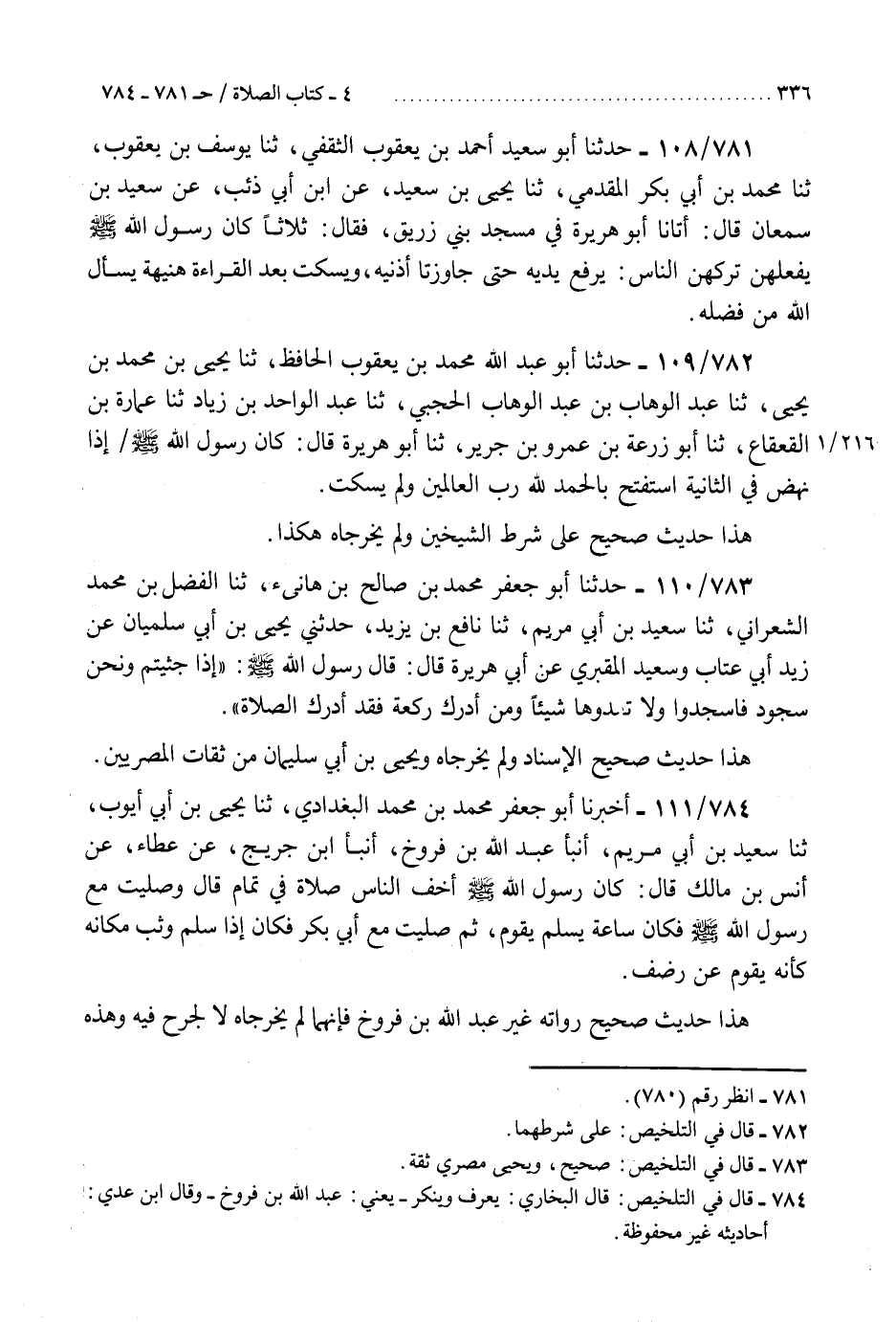 782 - حَدَّثَنَا أَبُو عَبْدِ اللَّهِ مُحَمَّدُ بْنُ يَعْقُوبَ الْحَافِظُ، ثنا يَحْيَى بْنُ مُحَمَّدِ بْنِ يَحْيَى، ثنا عَبْدُ اللهِ بْنُ عَبْدِ الْوَهَّابِ الْحَجَبِيُّ، ثنا عَبْدُ الْوَاحِدِ بْنُ زِيَادٍ، ثنا عُمَارَةُ بْنُ الْقَعْقَاعِ، ثنا أَبُو زُرْعَةَ بْنُ عَمْرِو بْنِ جَرِيرٍ، ثنا أَبُو هُرَيْرَةَ، قَالَ: كَانَ رَسُولُ اللَّهِ صَلَّى اللهُ عَلَيْهِ وَسَلَّمَ §«إِذَا نَهَضَ فِي الثَّانِيَةِ اسْتَفْتَحَ بِالْحَمْدُ لِلَّهِ رَبِّ الْعَالَمِينَ وَلَمْ يَسْكُتْ» . «هَذَا حَدِيثٌ صَحِيحٌ عَلَى شَرْطِ الشَّيْخَيْنِ وَلَمْ يُخَرِّجَاهُ هَكَذَا» K782 - على شرطهما