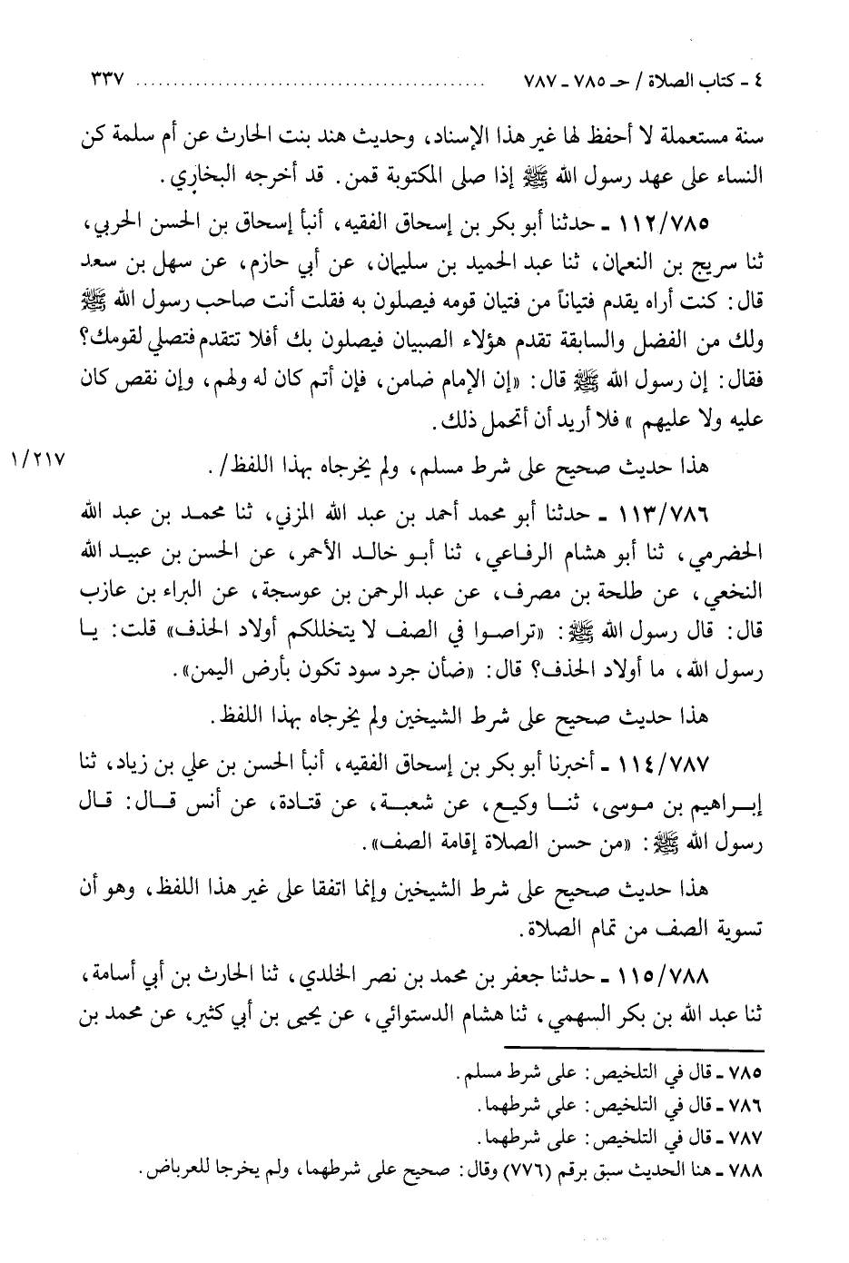 788 - حَدَّثَنَا جَعْفَرُ بْنُ مُحَمَّدِ بْنِ نَصْرٍ الْخُلْدِيُّ، ثنا الْحَارِثُ بْنُ أَبِي أُسَامَةَ، ثنا عَبْدُ اللَّهِ بْنُ بَكْرٍ السَّهْمِيُّ، ثنا هِشَامٌ الدَّسْتُوَائِيُّ، عَنْ يَحْيَى بْنِ أَبِي كَثِيرٍ، عَنْ مُحَمَّدِ بْنِ إِبْرَاهِيمَ بْنِ الْحَارِثِ، عَنْ خَالِدِ بْنِ مَعْدَانَ، عَنِ الْعِرْبَاضِ بْنِ سَارِيَةَ، أَنَّ رَسُولَ اللَّهِ صَلَّى اللهُ عَلَيْهِ وَسَلَّمَ كَانَ §«يَسْتَغْفِرُ لِلصَّفِّ الْمُقَدَّمِ ثَلَاثًا وَلِلثَّانِي مَرَّةً» . «هَذَا حَدِيثٌ صَحِيحُ الْإِسْنَادِ عَلَى الْوُجُوهِ كُلِّهَا إِلَّا أَنَّ الشَّيْخَيْنِ لَمْ يُخَرِّجَاهُ لِعِلَّةِ الرِّوَايَةِ، عَنِ الْعِرْبَاضِ، وَهُوَ مِمَّا قَدَّمْتُ فِيهِ الْقَوْلَ» K788 - على شرطهما