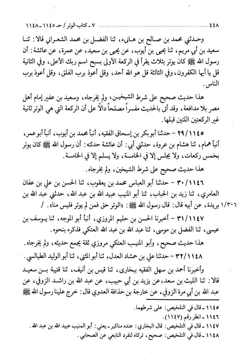 1148 - حَدَّثَنَا عَلِيُّ بْنُ حَمْشَاذٍ الْعَدْلُ، ثنا أَبُو الْمُثَنَّى، ثنا أَبُو الْوَلِيدِ الطَّيَالِسِيُّ، وَأَخْبَرَنَا أَحْمَدُ بْنُ سَهْلٍ الْفَقِيهُ، بِبُخَارَى، ثنا قَيْسُ بْنُ أُنَيْفٍ، ثنا قُتَيْبَةُ بْنُ سَعِيدٍ، قَالَا: ثنا اللَّيْثُ بْنُ سَعْدٍ، عَنْ يَزِيدَ بْنِ أَبِي حَبِيبٍ، عَنْ عَبْدِ اللَّهِ بْنِ رَاشِدٍ الزَّوْفِيِّ، عَنْ عَبْدِ اللَّهِ بْنِ أَبِي مُرَّةَ الزَّوْفِيِّ، عَنْ خَارِجَةَ بْنِ حُذَافَةَ الْعَدَوِيِّ، قَالَ: خَرَجَ عَلَيْنَا رَسُولُ اللَّهِ صَلَّى اللهُ عَلَيْهِ وَسَلَّمَ، فَقَالَ: «إِنَّ §اللَّهَ قَدْ أَمَدَّكُمْ بِصَلَاةٍ هِيَ خَيْرٌ لَكُمْ مِنْ حُمْرِ النَّعَمِ، وَهِيَ الْوِتْرُ، فَجَعَلَهَا لَكُمْ فِيمَا بَيْنَ صَلَاةِ الْعِشَاءِ إِلَى صَلَاةِ الْفَجْرِ» هَذَا حَدِيثٌ صَحِيحُ الْإِسْنَادِ، وَلَمْ يُخَرِّجَاهُ، رُوَاتُهُ مَدَنِيُّونَ ومِصْرِيُّونَ، وَلَمْ يَتْرُكَاهُ إِلَّا لِمَا قَدَّمْتُ ذِكْرَهُ مِنْ تَفَرُّدِ التَابِعِيِّ عَنِ الصَّحَابِيِّ"K1148 - صحيح