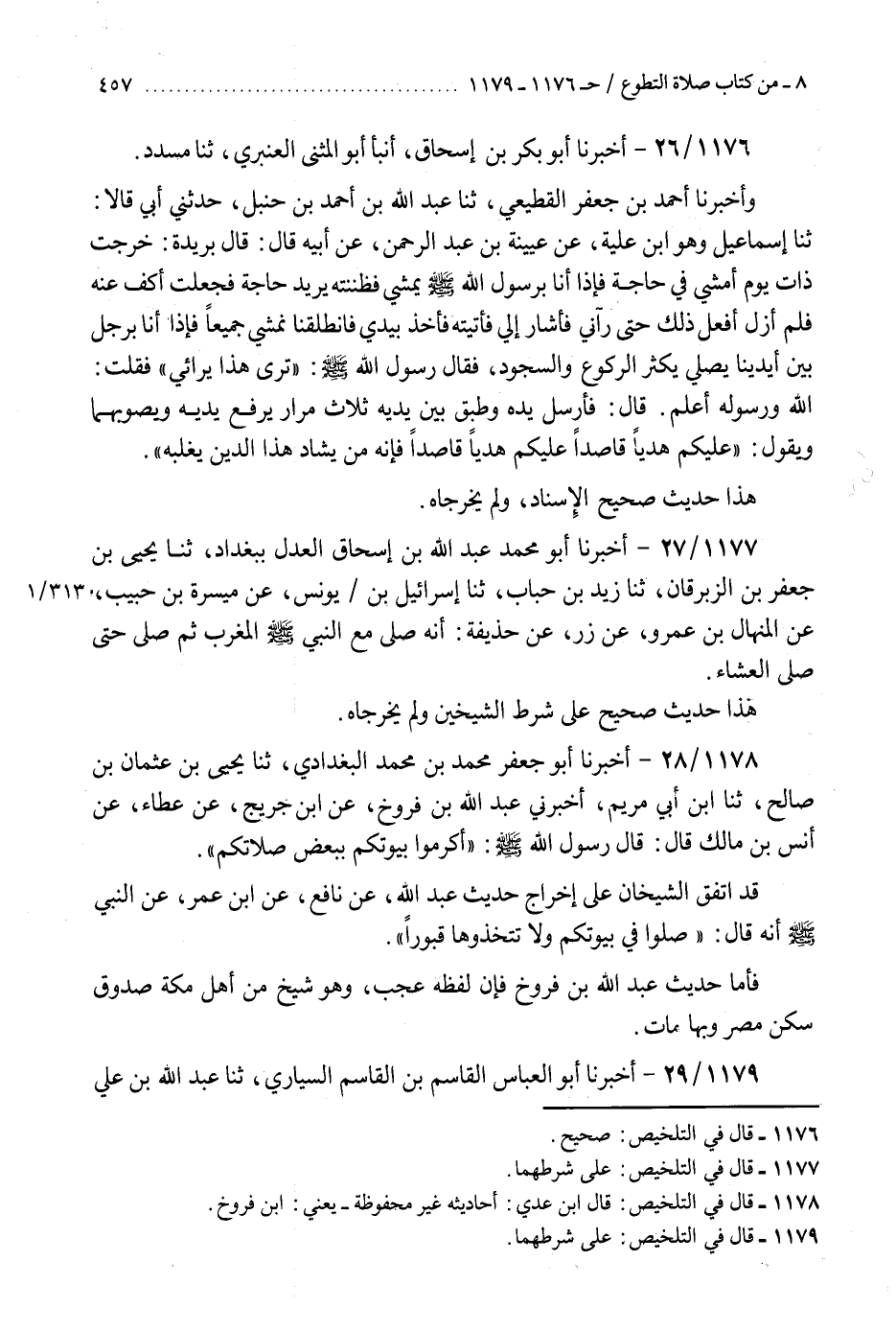 1176 - أَخْبَرَنَا أَبُو بَكْرِ بْنُ إِسْحَاقَ، أَنْبَأَ أَبُو الْمُثَنَّى الْعَنْبَرِيُّ، ثنا مُسَدَّدٌ، وَأَخْبَرَنَا أَحْمَدُ بْنُ جَعْفَرٍ الْقَطِيعِيُّ، ثنا عَبْدُ اللَّهِ بْنُ أَحْمَدَ بْنِ حَنْبَلٍ، حَدَّثَنِي أَبِي قَالَا: ثنا إِسْمَاعِيلُ وَهُوَ ابْنُ عُلَيَّةَ، عَنْ عُيَيْنَةَ بْنِ عَبْدِ الرَّحْمَنِ، عَنْ أَبِيهِ، قَالَ: قَالَ بُرَيْدَةُ: خَرَجْتُ ذَاتَ يَوْمٍ أَمْشِي فِي حَاجَةٍ، فَإِذَا أَنَا بِرَسُولِ اللَّهِ صَلَّى اللهُ عَلَيْهِ وَسَلَّمَ يَمْشِي فَظَنَنْتُهُ يُرِيدُ حَاجَةً، فَجَعَلْتُ أَكُفُّ عَنْهُ، فَلَمْ أَزَلْ أَفْعَلُ ذَلِكَ حَتَّى رَآنِي، فَأَشَارَ إِلَيَّ فَأَتَيْتُهُ فَأَخَذَ بِيَدِي، فَانْطَلَقْنَا نَمْشِي جَمِيعًا، فَإِذَا أَنَا بِرَجُلٍ بَيْنَ أَيْدِينَا يُصَلِّي يُكْثِرُ الرُّكُوعَ وَالسُّجُودَ، فَقَالَ رَسُولُ اللَّهِ صَلَّى اللهُ عَلَيْهِ وَسَلَّمَ: «تُرَى هَذَا يُرَائِي؟» فَقُلْتُ: اللَّهُ وَرَسُولُهُ أَعْلَمُ، قَالَ: " فَأَرْسَلَ يَدَهُ وَطَبَّقَ بَيْنَ يَدَيْهِ ثَلَاثَ مِرَارٍ يَرْفَعُ يَدَيْهِ وَيُصَوِّبُهُمَا وَيَقُولُ: «عَلَيْكُمْ هَدْيًا قَاصِدًا، عَلَيْكُمْ هَدْيًا قَاصِدًا، فَإِنَّهُ §مَنْ يُشَادَّ هَذَا الدِّينَ يَغْلِبُهُ» هَذَا حَدِيثٌ صَحِيحُ الْإِسْنَادِ، وَلَمْ يُخَرِّجَاهُ "