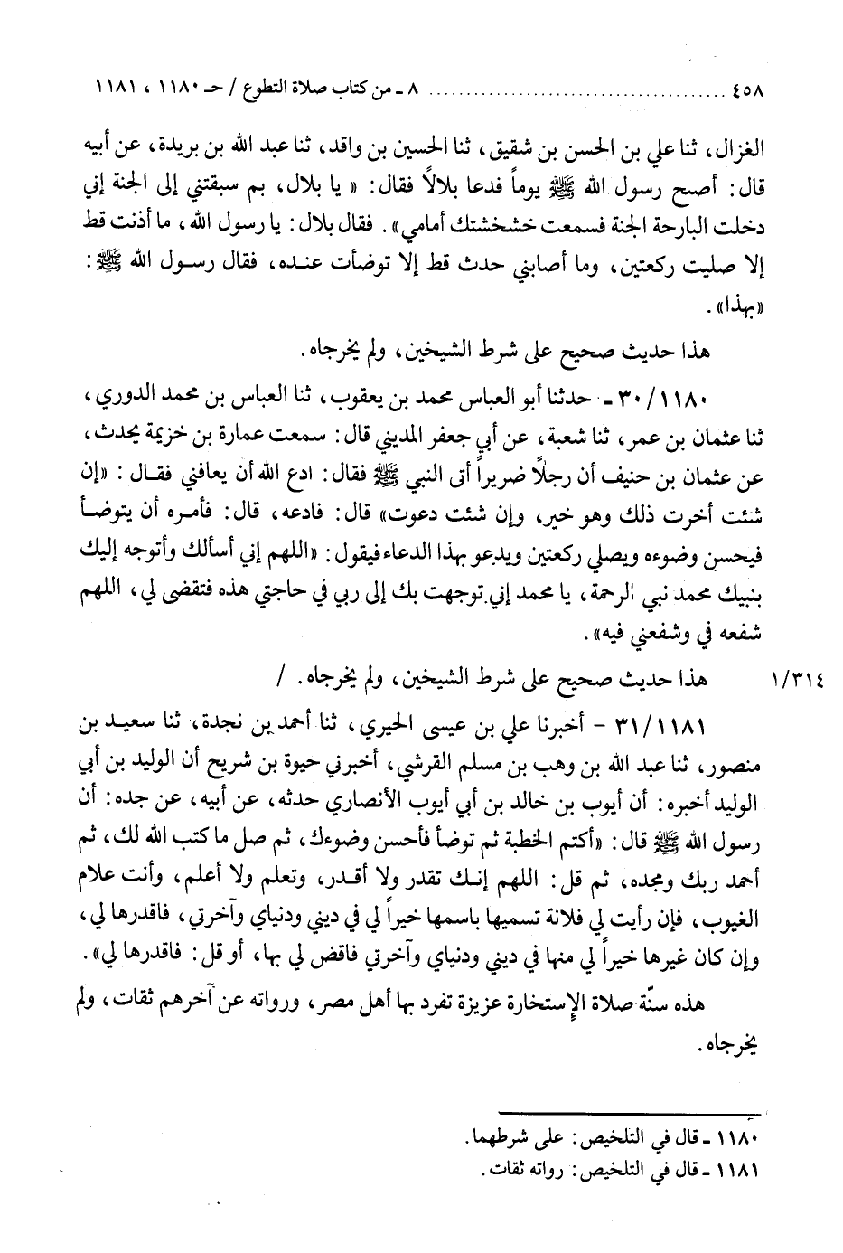 1181 - أَخْبَرَنَا عَلِيُّ بْنُ عِيسَى الْحِيرِيُّ، ثنا أَحْمَدُ بْنُ نَجْدَةَ، ثنا سَعِيدُ بْنُ مَنْصُورٍ، ثنا عَبْدُ اللَّهِ بْنُ وَهْبِ بْنِ مُسْلِمٍ الْقُرَشِيُّ، أَخْبَرَنِي حَيْوَةُ بْنُ شُرَيْحٍ، أَنَّ الْوَلِيدَ بْنَ أَبِي الْوَلِيدٍ، أَخْبَرَهُ أَنَّ أَيُّوبَ بْنَ خَالِدِ بْنِ أَبِي أَيُّوبَ الْأَنْصَارِيَّ حَدَّثَهُ، عَنْ أَبِيهِ، عَنْ جَدِّهِ، أَنَّ رَسُولَ اللَّهِ صَلَّى اللهُ عَلَيْهِ وَسَلَّمَ، قَالَ: " §اكْتُمِ الْخِطْبَةَ، ثُمَّ تَوَضَّأْ فَأَحْسِنْ وُضُوءَكَ، ثُمَّ صَلِّ مَا كَتَبَ اللَّهُ لَكَ، ثُمَّ احْمَدْ رَبَّكَ وَمَجِّدْهُ، ثُمَّ قُلِ: اللَّهُمَّ إِنَّكَ تَقْدِرُ وَلَا أَقْدِرُ، وَتَعْلَمُ وَلَا أَعْلَمُ، وَأَنْتَ عَلَّامُ الْغُيُوبِ، فَإِنْ رَأَيْتَ لِي فُلَانَةً تُسَمِّيهَا بِاسْمِهَا خَيْرًا لِي فِي دِينِي وَدُنْيَايَ وَآخِرَتِي، فَاقْدُرْهَا لِي، وَإِنْ كَانَ غَيْرُهَا خَيْرًا لِي مِنْهَا فِي دِينِي وَدُنْيَايَ وَآخِرَتِي، فَاقْضِ لِي بِهَا " أَوْ قُلْ: «فَاقْدُرْهَا لِي» هَذِهِ سُنَّةُ صَلَاةِ الِاسْتِخَارَةِ عَزِيزَةٌ تَفَرَّدَ بِهَا أَهْلُ مِصْرَ، ورُوَاتُهُ عَنْ آخِرِهِمْ ثِقَاتٌ، وَلَمْ يُخَرِّجَاهُ "
