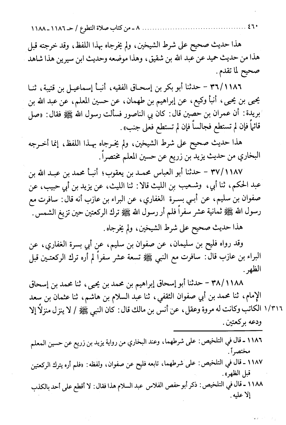 1188 - حَدَّثَنَا أَبُو إِسْحَاقَ إِبْرَاهِيمُ بْنُ مُحَمَّدِ بْنِ يَحْيَى، ثنا مُحَمَّدُ بْنُ إِسْحَاقَ الْإِمَامُ، ثنا مُحَمَّدُ بْنُ أَبِي صَفْوَانَ الثَّقَفِيُّ، ثنا عَبْدُ السَّلَامِ بْنُ هَاشِمٍ، ثنا عُثْمَانُ بْنُ سَعْدٍ الْكَاتِبُ، وَكَانَتْ لَهُ مُرُوَّةٌ وَعَقْلٌ، عَنْ أَنَسِ بْنِ مَالِكٍ، قَالَ: «كَانَ النَّبِيُّ صَلَّى اللهُ عَلَيْهِ وَسَلَّمَ §لَا يَنْزِلُ مَنْزِلًا إِلَّا وَدَّعَهُ بِرَكْعَتَيْنِ» هَذَا حَدِيثٌ صَحِيحٌ، وَلَمْ يُخَرِّجَاهُ «وَعُثْمَانُ بْنُ سَعْدٍ الْكَاتِبُ مِمَّنْ يُجْمَعُ حَدِيثُهُ فِي الْبَصْرِيِّينَ»