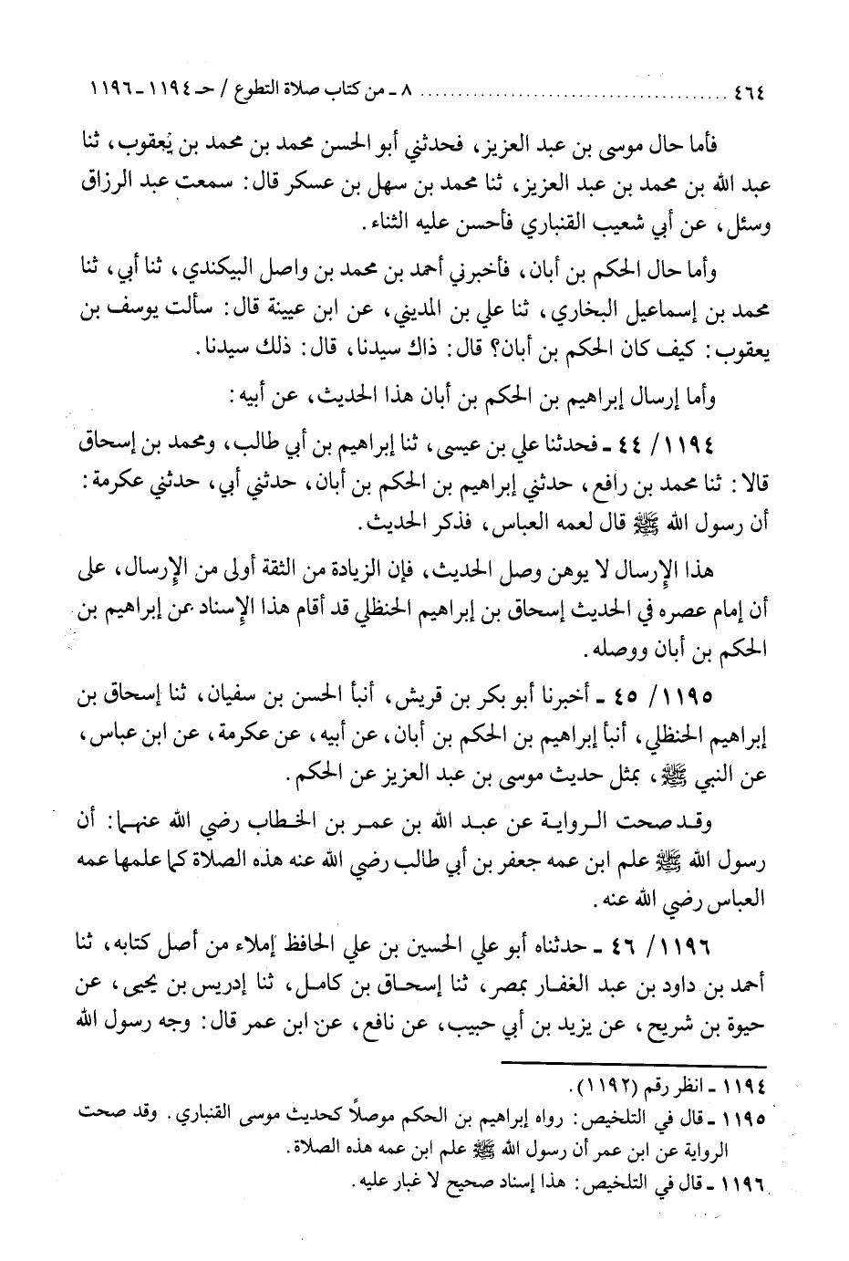 1196 - حَدَّثَنَاهُ أَبُو عَلِيٍّ الْحُسَيْنُ بْنُ عَلِيٍّ الْحَافِظُ إِمْلَاءً مِنْ أَصْلِ كِتَابِهِ، ثنا أَحْمَدُ بْنُ دَاوُدَ بْنِ عَبْدِ الْغَفَّارِ بِمِصْرَ، ثنا إِسْحَاقُ بْنُ كَامِلٍ، ثنا إِدْرِيسُ بْنُ يَحْيَى، عَنْ حَيْوَةَ بْنِ شُرَيْحٍ، عَنْ يَزِيدَ بْنِ أَبِي حَبِيبٍ، عَنْ نَافِعٍ، عَنِ ابْنِ عُمَرَ، قَالَ: وَجَّهَ رَسُولُ اللَّهِ صَلَّى اللهُ عَلَيْهِ وَسَلَّمَ جَعْفَرَ بْنَ أَبِي طَالِبٍ إِلَى بِلَادِ الْحَبَشَةِ، فَلَمَّا قَدِمَ اعْتَنَقَهُ وَقَبَّلَ بَيْنَ عَيْنَيْهِ، ثُمَّ قَالَ: «أَلَا أَهَبُ لَكَ، أَلَا أُبَشِّرُكَ، أَلَا أَمْنَحُكَ، أَلَا أُتْحِفُكَ؟» قَالَ: نَعَمْ، يَا رَسُولَ اللَّهِ. قَالَ: " §تُصَلِّي أَرْبَعَ رَكَعَاتٍ تَقْرَأُ فِي كُلِّ رَكْعَةٍ بِالْحَمْدِ وَسُورَةٍ، ثُمَّ تَقُولُ بَعْدَ الْقِرَاءَةِ وَأَنْتَ قَائِمٌ قَبْلَ الرُّكُوعِ: سُبْحَانَ اللَّهِ، وَالْحَمْدُ لِلَّهِ، وَلَا إِلَهَ إِلَّا اللَّهُ، وَاللَّهُ أَكْبَرُ، وَلَا حَوْلَ وَلَا قُوَّةَ إِلَّا بِاللَّهِ خَمْسَ عَشْرَةَ مَرَّةً، ثُمَّ تَرْكَعُ فَتَقُولُهُنَّ عَشْرًا تَمَامَ هَذِهِ الرَّكْعَةِ قَبْلَ أَنْ تَبْتَدِئَ بِالرَّكْعَةِ الثَّانِيَةِ، تَفْعَلُ فِي الثَّلَاثِ رَكَعَاتٍ كَمَا وَصَفْتَ لَكَ حَتَّى تُتِمَّ أَرْبَعَ رَكَعَاتٍ «هَذَا إِسْنَادٌ صَحِيحٌ لَا غُبَارَ عَلَيْهِ، وَمِمَّا يُسْتَدَلُّ بِهِ عَلَى صِحَّةِ هَذَا الْحَدِيثِ اسْتِعْمَالُ الْأَئِمَّةِ مِنْ أَتْبَاعِ التَّابِعِينَ إِلَى عَصْرِنَا هَذَا إِيَّاهُ وَمَوَاظَبَتُهُمْ عَلَيْهِ وَتَعْلِيمُهُنَّ النَّاسَ، مِنْهُمْ عَبْدُ اللَّهِ بْنُ الْمُبَارَكِ رَحْمَةُ اللَّهِ عَلَيْهِ»