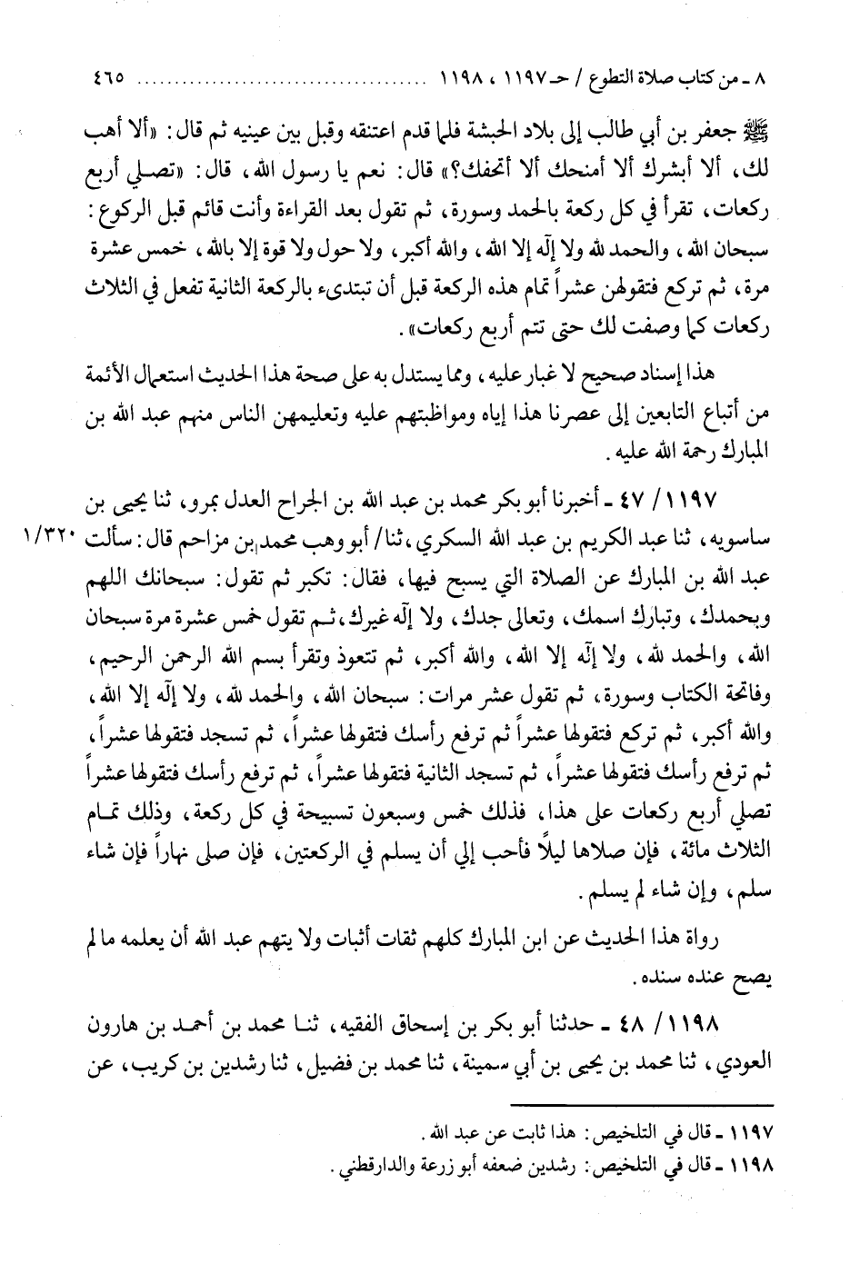 1197 - أَخْبَرَنَا أَبُو بَكْرٍ مُحَمَّدُ بْنُ عَبْدِ اللَّهِ الْجَرَّاحُ الْعَدْلُ بِمَرْوَ، ثنا يَحْيَى بْنُ سَاسَوَيْهِ، ثنا عَبْدُ الْكَرِيمِ بْنُ عَبْدِ اللَّهِ السُّكَّرِيُّ، ثنا أَبُو وَهْبٍ مُحَمَّدُ بْنُ مُزَاحِمٍ، قَالَ: سَأَلْتُ عَبْدَ اللَّهِ بْنَ الْمُبَارَكِ، عَنِ الصَّلَاةِ الَّتِي يُسَبَّحُ فِيهَا، فَقَالَ: " §تُكَبِّرُ ثُمَّ تَقُولُ: سُبْحَانَكَ اللَّهُمَّ وَبِحَمْدِكَ، وَتَبَارَكَ اسْمُكَ، وَتَعَالَى جَدُّكَ وَلَا إِلَهَ غَيْرُكَ، ثُمَّ تَقُولُ خَمْسَ عَشْرَةَ مَرَّةً: سُبْحَانَ اللَّهِ، وَالْحَمْدُ لِلَّهِ، وَلَا إِلَهَ إِلَّا اللَّهُ، وَاللَّهُ أَكْبَرُ، ثُمَّ تَتَعَوَّذُ وَتَقْرَأُ بِسْمِ اللَّهِ الرَّحْمَنِ الرَّحِيمِ وَفَاتِحَةِ الْكِتَابِ وَسُورَةً، ثُمَّ تَقُولُ عَشْرَ مَرَّاتٍ: سُبْحَانَ اللَّهِ، وَالْحَمْدُ لِلَّهِ، وَلَا إِلَهَ إِلَّا اللَّهُ، وَاللَّهُ أَكْبَرُ، ثُمَّ تَرْكَعُ فَتَقُولُهَا عَشْرًا، ثُمَّ تَرْفَعُ رَأْسَكَ فَتَقُولُهَا عَشْرًا، ثُمَّ تَسْجُدُ فَتَقُولُهَا عَشْرًا، ثُمَّ تَرْفَعُ رَأْسَكَ فَتَقُولُهَا عَشْرًا، ثُمَّ تَسْجُدُ الثَّانِيَةَ فَتَقُولُهَا عَشْرًا، ثُمَّ تَرْفَعُ رَأْسَكَ فَتَقُولُهَا عَشْرًا تُصَلِّي أَرْبَعَ رَكَعَاتٍ عَلَى هَذَا فَذَلِكَ خَمْسٌ وَسَبْعُونَ تَسْبِيحَةً فِي كُلِّ رَكْعَةٍ، وَذَلِكَ تَمَامُ الثَّلَاثِ مِائَةٍ، فَإِنْ صَلَّاهَا لَيْلًا فَأَحَبُّ إِلَيَّ أَنْ يُسَلِّمَ فِي الرَّكْعَتَيْنِ، فَإِنْ صَلَّى نَهَارًا فَإِنْ شَاءَ سَلَّمَ، وَإِنْ شَاءَ لَمْ يُسَلِّمْ «رُوَاةُ هَذَا الْحَدِيثِ عَنِ ابْنِ الْمُبَارَكِ كُلُّهُمْ ثِقَاتٌ أَثْبَاتٌ، وَلَا يُتَّهَمُ عَبْدُ اللَّهِ أَنْ يُعَلِّمَهُ مَا لَمْ يَصِحَّ عِنْدَهُ سَنَدُهُ»