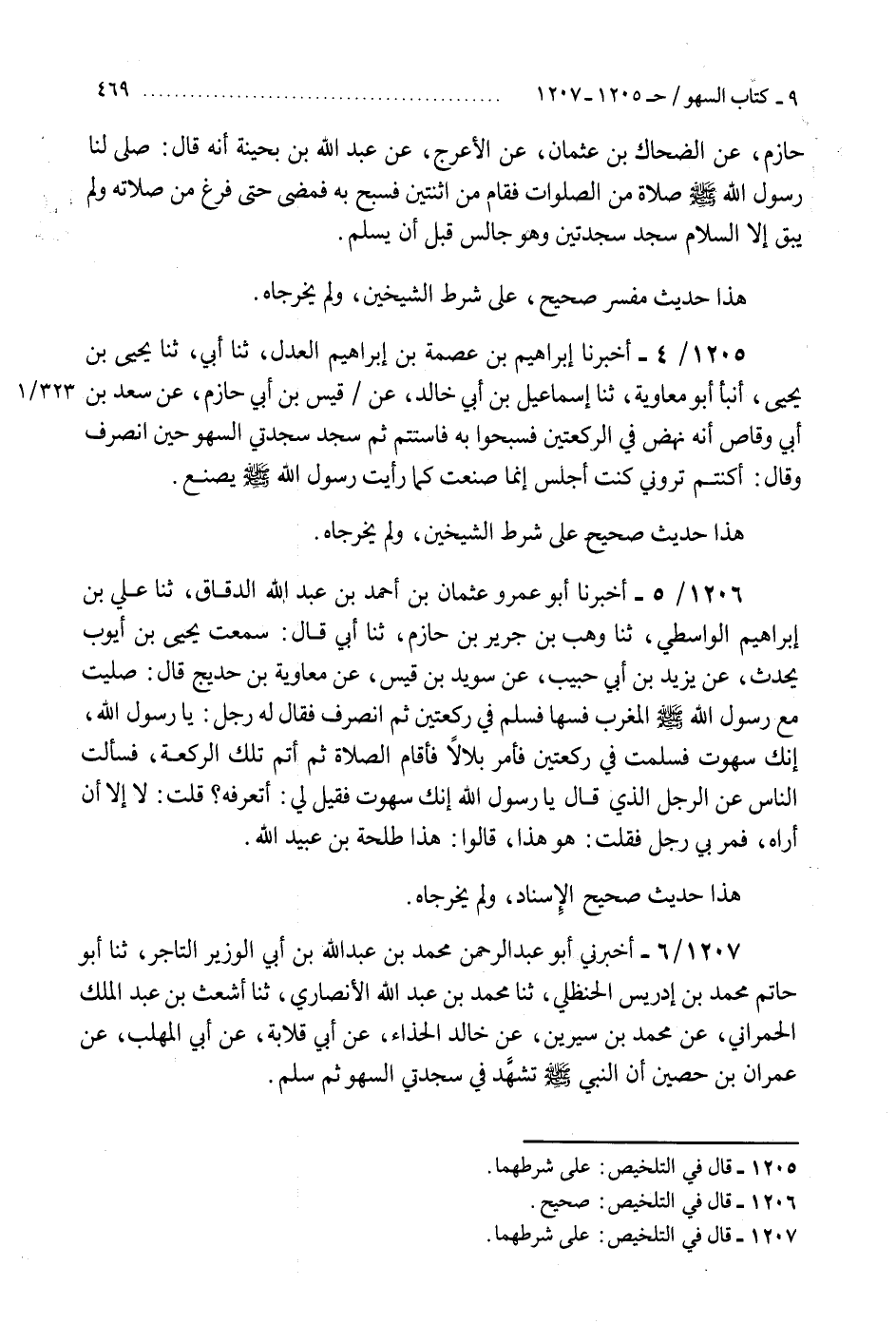1207 - أَخْبَرَنِي أَبُو عَبْدِ الرَّحْمَنِ مُحَمَّدُ بْنُ عَبْدِ اللَّهِ بْنِ أَبِي الْوَزِيرِ التَّاجِرُ، ثنا أَبُو حَاتِمٍ مُحَمَّدُ بْنُ إِدْرِيسَ الْحَنْظَلِيُّ، ثنا مُحَمَّدُ بْنُ عَبْدِ اللَّهِ الْأَنْصَارِيُّ، ثنا أَشْعَثُ بْنُ عَبْدِ الْمَلِكِ الْحُمْرَانِيُّ، عَنْ مُحَمَّدِ بْنِ سِيرِينَ، عَنْ خَالِدٍ الْحَذَّاءِ، عَنْ أَبِي قِلَابَةَ، عَنْ أَبِي الْمُهَلَّبِ، عَنْ عِمْرَانَ بْنِ حُصَيْنٍ، «أَنَّ النَّبِيَّ صَلَّى اللهُ عَلَيْهِ وَسَلَّمَ §تَشَهَّدَ فِي سَجْدَتَيِ السَّهْوِ، ثُمَّ سَلَّمَ» هَذَا حَدِيثٌ صَحِيحٌ عَلَى شَرْطِ الشَّيْخَيْنِ، وَلَمْ يُخَرِّجَاهُ، إِنَّمَا اتَّفَقَا عَلَى حَدِيثِ خَالِدٍ الْحَذَّاءِ، عَنْ أَبِي قِلَابَةَ، وَلَيْسَ فِيهِ ذِكْرُ التَّشَهُّدِ لِسَجْدَتَيِ السَّهْوِ "