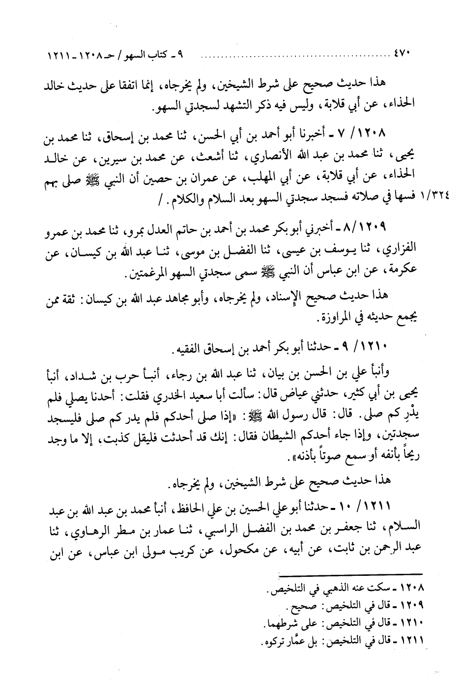 1208 - أَخْبَرَنَا أَبُو أَحْمَدَ بْنُ أَبِي الْحَسَنِ، ثنا مُحَمَّدُ بْنُ إِسْحَاقَ، ثنا مُحَمَّدُ بْنُ يَحْيَى، ثنا مُحَمَّدُ بْنُ عَبْدِ اللَّهِ الْأَنْصَارِيُّ، ثنا أَشْعَثُ، عَنْ مُحَمَّدِ بْنِ سِيرِينَ، عَنْ خَالِدٍ الْحَذَّاءِ، عَنْ أَبِي قِلَابَةَ، عَنْ أَبِي الْمُهَلَّبِ، عَنْ عِمْرَانَ بْنِ حُصَيْنٍ، «أَنَّ النَّبِيَّ صَلَّى اللهُ عَلَيْهِ وَسَلَّمَ §صَلَّى بِهِمْ فَسَهَا فِي صَلَاتِهِ، فَسَجَدَ سَجْدَتَي السَّهْوِ بَعْدَ السَّلَامِ وَالْكَلَامِ»