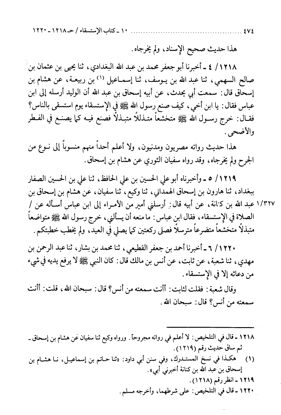 1220 - أَخْبَرَنَا أَحْمَدُ بْنُ جَعْفَرٍ الْقَطِيعِيُّ، ثنا مُحَمَّدُ بْنُ بَشَّارٍ، ثنا عَبْدُ الرَّحْمَنِ بْنُ مَهْدِيٍّ، ثنا شُعْبَةُ، عَنْ ثَابِتٍ، عَنْ أَنَسِ بْنِ مَالِكٍ، قَالَ: «كَانَ النَّبِيُّ صَلَّى اللهُ عَلَيْهِ وَسَلَّمَ §لَا يَرْفَعُ يَدَيْهِ فِي شَيْءٍ مِنْ دُعَائِهِ إِلَّا فِي الِاسْتِسْقَاءِ» وَقَالَ شُعْبَةُ: فَقُلْتُ لِثَابِتٍ: أَأَنْتَ سَمِعْتَهُ مِنْ أَنَسٍ؟ قَالَ: سُبْحَانَ اللَّهِ، قُلْتُ: أَأَنْتَ سَمِعْتَ مِنْ أَنَسٍ؟ قَالَ: سُبْحَانَ اللَّهِ. «هَذَا حَدِيثٌ صَحِيحٌ عَلَى شَرْطِ الشَّيْخَيْنِ، وَقَدْ خَرَّجَهُ مُسْلِمٌ، مِنْ حَدِيثِ يَحْيَى بْنِ أَبِي بُكَيْرٍ، عَنْ شُعْبَةَ»
