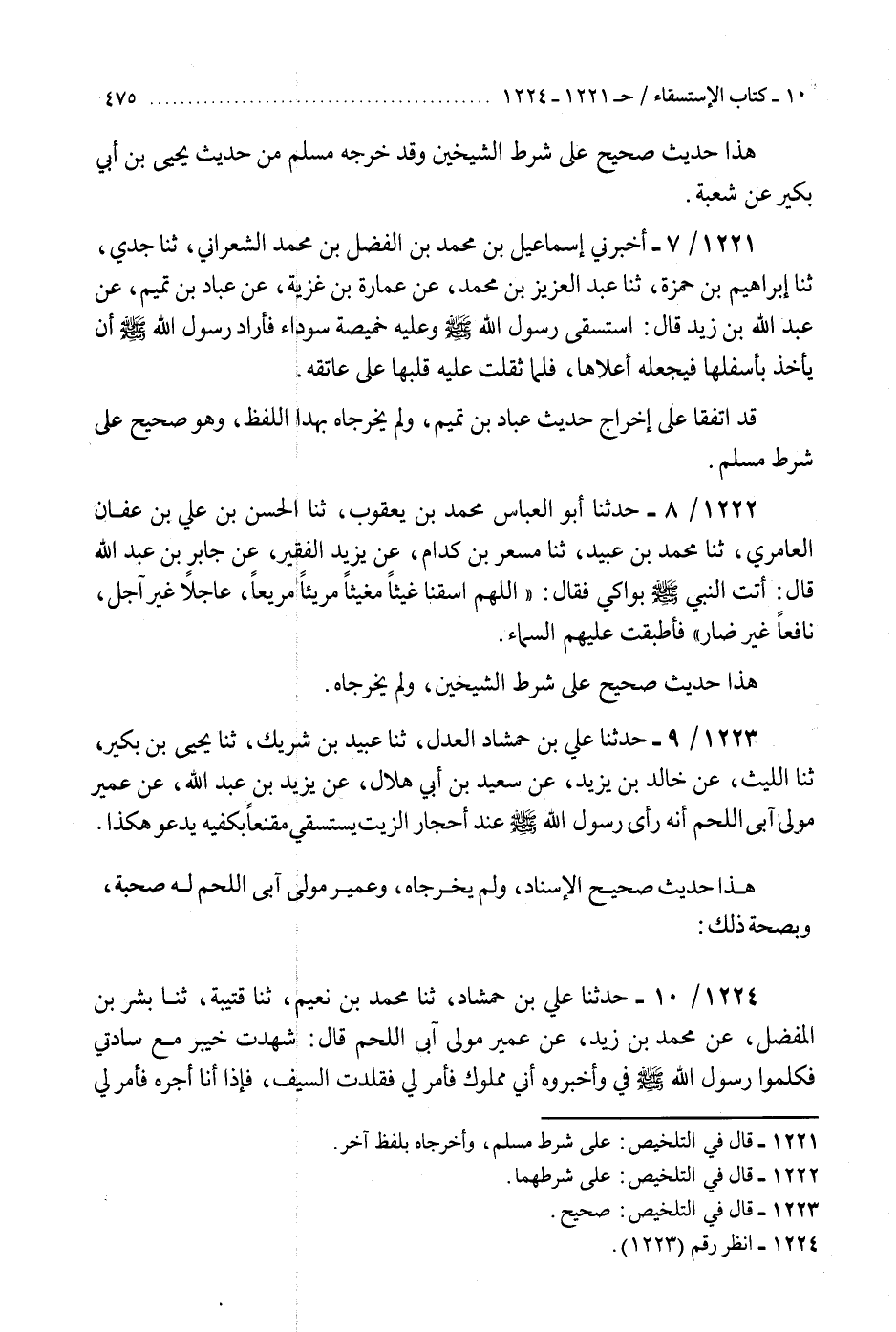 1223 - حَدَّثَنَا عَلِيُّ بْنُ حَمْشَاذَ الْعَدْلُ، ثنا عُبَيْدُ بْنُ شَرِيكٍ، ثنا يَحْيَى بْنُ بُكَيْرٍ، ثنا اللَّيْثُ، عَنْ خَالِدِ بْنِ يَزِيدَ، عَنْ سَعِيدِ بْنِ أَبِي هِلَالٍ، عَنْ يَزِيدَ بْنِ عَبْدِ اللَّهِ، عَنْ عُمَيْرٍ، مَوْلَى آبِي اللَّحْمِ، أَنَّهُ§«رَأَى رَسُولَ اللَّهِ صَلَّى اللهُ عَلَيْهِ وَسَلَّمَ عِنْدَ أَحْجَارِ الزَّيْتِ يَسْتَسْقِي مُقَنَّعًا بِكَفَّيْهِ يَدْعُو هَكَذَا» هَذَا حَدِيثٌ صَحِيحُ الْإِسْنَادِ، وَلَمْ يُخَرِّجَاهُ «وَعُمَيْرٌ مَوْلَى آبِي اللَّحْمِ لَهُ صُحْبَةٌ وَبِصِحَّةِ ذَلِكَ»