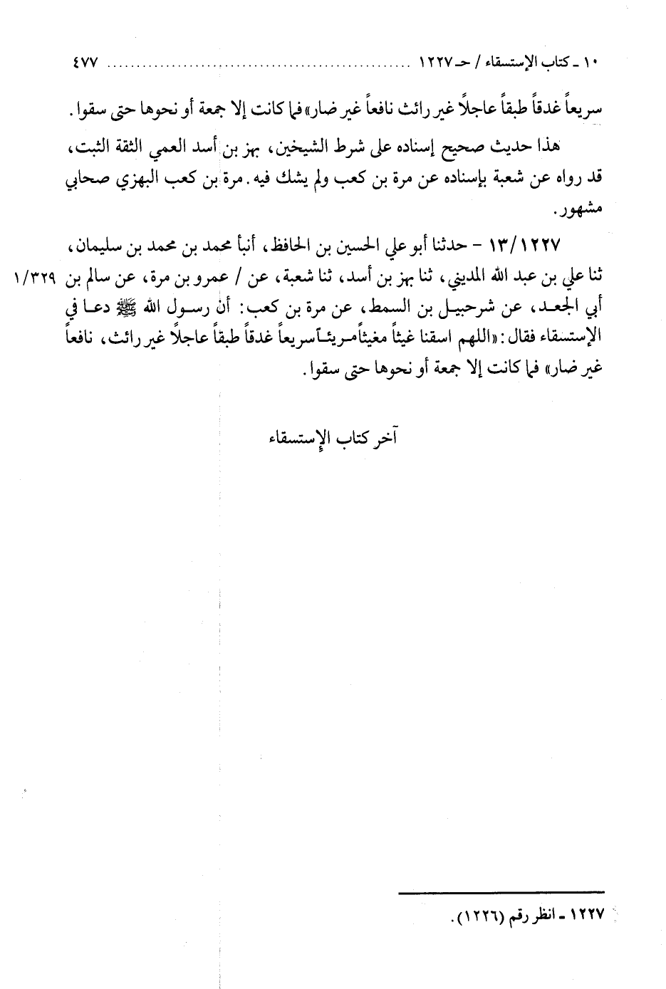 1227 - حَدَّثَنَا أَبُو عَلِيٍّ الْحُسَيْنُ بْنُ الْحَافِظِ، أَنْبَأَ مُحَمَّدُ بْنُ مُحَمَّدِ بْنِ سُلَيْمَانَ، ثنا عَلِيُّ بْنُ عَبْدِ اللَّهِ الْمَدِينِيُّ، ثنا بَهْزُ بْنُ أَسَدِ، ثنا شُعْبَةُ، عَنْ عَمْرِو بْنِ مُرَّةَ، عَنْ سَالِمِ بْنِ أَبِي الْجَعْدِ، عَنْ شُرَحْبِيلَ بْنِ السِّمْطِ، عَنْ مَرَّةَ بْنِ كَعْبٍ، أَنَّ رَسُولَ اللَّهِ صَلَّى اللهُ عَلَيْهِ وَسَلَّمَ دَعَا فِي الِاسْتِسْقَاءِ، فَقَالَ: «§اللَّهُمَّ اسْقِنَا غَيْثًا مُغِيثًا، مَرِيئًا سَرِيعًا، غَدَقًا طَبَقًا، عَاجِلًا غَيْرَ رَائِثٍ، نَافِعًا غَيْرَ ضَارٍّ» ، فَمَا كَانَتْ إِلَّا جُمُعَةٌ أَوْ نَحْوُهَا حَتَّى سُقُوا آخِرُ -[478]- كِتَابِ الِاسْتِسْقَاءِ