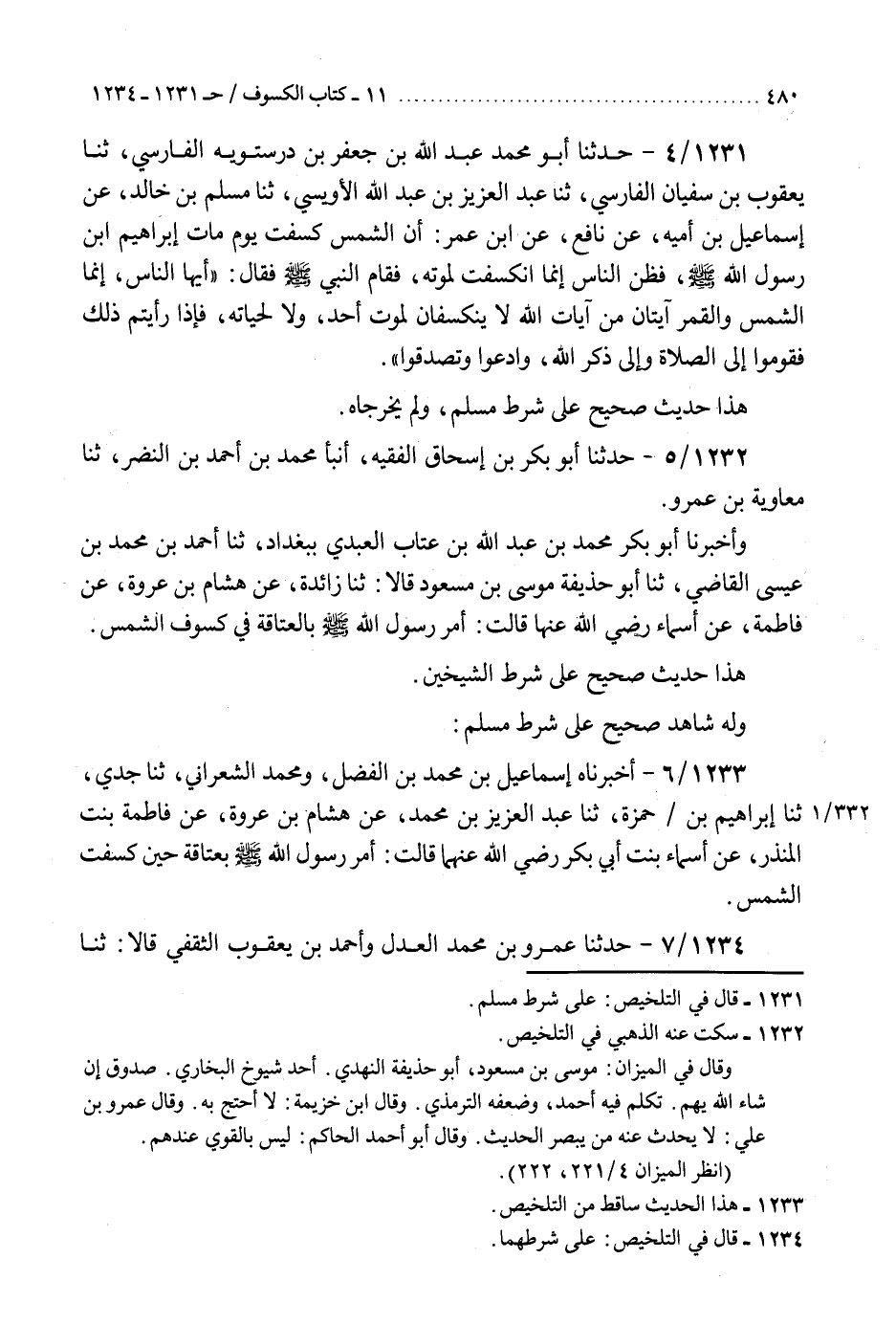1232 - حَدَّثَنَا أَبُو بَكْرِ بْنُ إِسْحَاقَ الْفَقِيهُ، أَنْبَأَ مُحَمَّدُ بْنُ أَحْمَدَ بْنِ النَّضْرِ، ثنا مُعَاوِيَةُ بْنُ عَمْرٍو، وَأَخْبَرَنَا أَبُو بَكْرٍ مُحَمَّدُ بْنُ عَبْدِ اللَّهِ بْنِ عَتَّابٍ الْعَبْدِيُّ بِبَغْدَادَ، ثنا أَحْمَدُ بْنُ مُحَمَّدِ بْنِ عِيسَى الْقَاضِي، ثنا أَبُو حُذَيْفَةَ مُوسَى بْنُ مَسْعُودٍ، قَالَا: ثنا زَائِدَةُ، عَنْ هِشَامِ بْنِ عُرْوَةَ، عَنْ فَاطِمَةَ، عَنْ أَسْمَاءَ، رَضِيَ اللَّهُ عَنْهَا، قَالَتْ: §«أَمَرَ رَسُولُ اللَّهِ صَلَّى اللهُ عَلَيْهِ وَسَلَّمَ بِالْعَتَاقَةِ فِي كُسُوفِ الشَّمْسِ» هَذَا حَدِيثٌ صَحِيحٌ عَلَى شَرْطِ الشَّيْخَيْنِ، وَلَهُ شَاهِدٌ صَحِيحٌ عَلَى شَرْطِ مُسْلِمٍ "