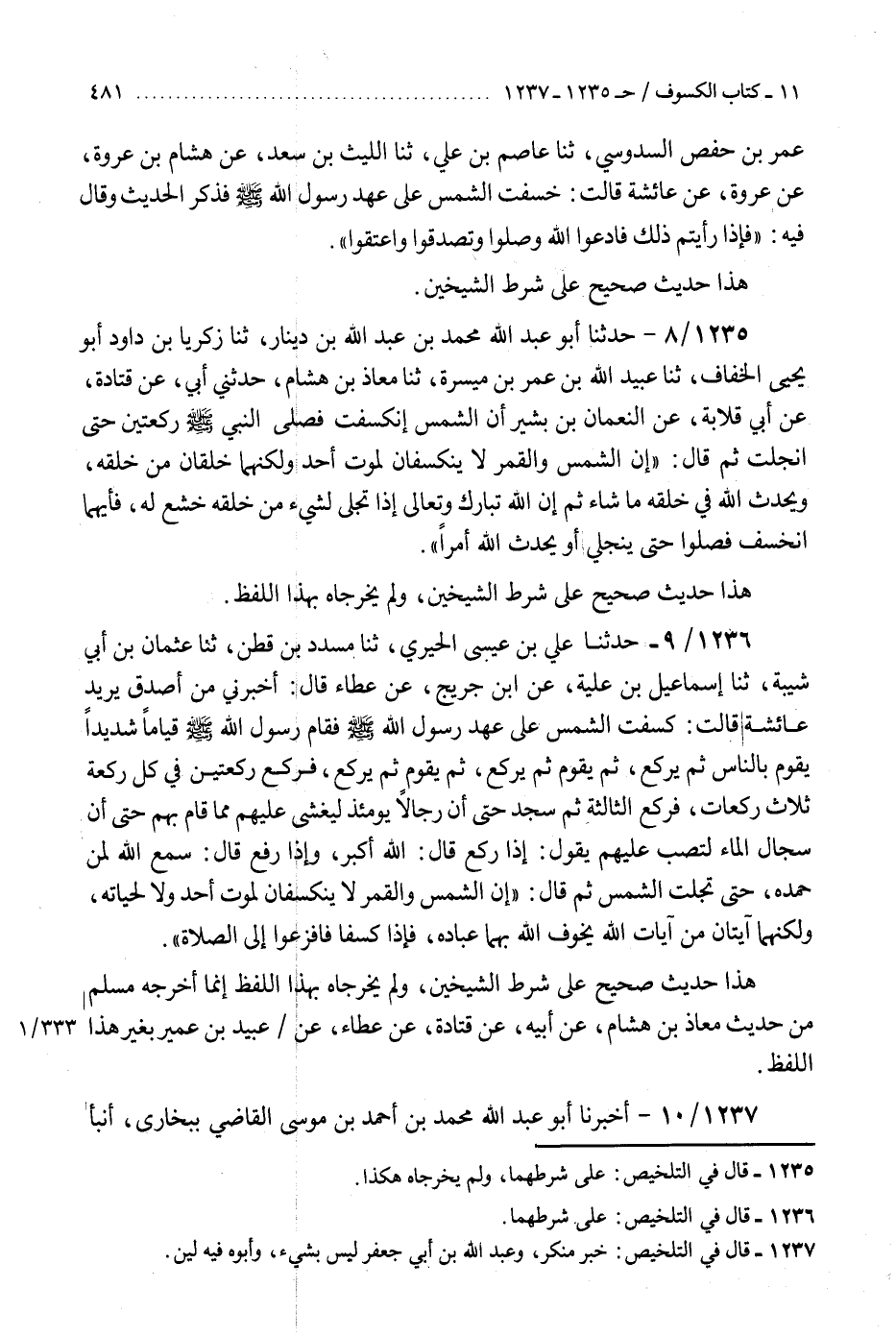 1235 - حَدَّثَنَا أَبُو عَبْدِ اللَّهِ مُحَمَّدُ بْنُ عَبْدِ اللَّهِ بْنِ دِينَارٍ، ثنا زَكَرِيَّا بْنُ دَاوُدَ أَبُو يَحْيَى الْخَفَّافُ، ثنا عُبَيْدُ اللَّهِ بْنُ عُمَرَ بْنِ مَيْسَرَةَ، ثنا مُعَاذُ بْنُ هِشَامٍ، حَدَّثَنِي أَبِي، عَنْ قَتَادَةَ، عَنْ أَبِي قِلَابَةَ، عَنِ النُّعْمَانِ بْنِ بَشِيرٍ، أَنَّ الشَّمْسَ انْكَسَفَتْ، فَصَلَّى النَّبِيُّ صَلَّى اللهُ عَلَيْهِ وَسَلَّمَ رَكْعَتَيْنِ حَتَّى انْجَلَتْ، ثُمَّ قَالَ: «إِنَّ §الشَّمْسَ وَالْقَمَرَ لَا يَنْكَسِفَانِ لِمَوْتِ أَحَدٍ، وَلَكِنَّهُمَا خَلْقَانِ مِنْ خَلْقِهِ، وَيُحْدِثُ اللَّهُ فِي خَلْقِهِ مَا شَاءَ، ثُمَّ إِنَّ اللَّهَ تَبَارَكَ وَتَعَالَى إِذَا تَجَلَّى لِشَيْءٍ مِنْ خَلْقِهِ خَشَعَ لَهُ، فَأَيُّهُمَا انْخَسَفَ، فَصَلُّوا حَتَّى يَنْجَلِيَ، أَوْ يُحْدِثَ اللَّهُ أَمْرًا» هَذَا حَدِيثٌ صَحِيحٌ عَلَى شَرْطِ الشَّيْخَيْنِ، وَلَمْ يُخَرِّجَاهُ بِهَذَا اللَّفْظِ "