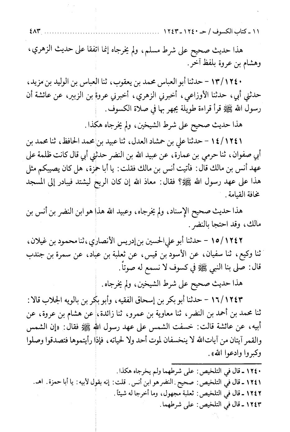 1243 - حَدَّثَنَا أَبُو بَكْرِ بْنُ إِسْحَاقَ الْفَقِيهُ، وَأَبُو بَكْرِ بْنُ بَالَوَيْهِ الْجَلَّابُ، قَالَا: ثنا مُحَمَّدُ بْنُ أَحْمَدَ بْنِ النَّضْرِ، ثنا مُعَاوِيَةُ بْنُ عَمْرٍو، ثنا زَائِدَةُ، عَنْ هِشَامِ بْنِ عُرْوَةَ، عَنْ أَبِيهِ، عَنْ عَائِشَةَ، قَالَتْ: خَسَفَتِ الشَّمْسُ عَلَى عَهْدِ رَسُولِ اللَّهِ صَلَّى اللهُ عَلَيْهِ وَسَلَّمَ، فَقَالَ: «إِنَّ §الشَّمْسَ وَالْقَمَرَ آيَتَانِ مِنْ آيَاتِ اللَّهِ لَا يَنْخَسِفَانِ لِمَوْتِ أَحَدٍ وَلَا لِحَيَاتِهِ، فَإِذَا رَأَيْتُمُوهَا فَتَصَدَّقُوا وَصَلُّوا، وَكَبِّرُوا، وَادْعُوا اللَّهَ» هَذَا حَدِيثٌ صَحِيحٌ عَلَى شَرْطِ الشَّيْخَيْنِ، وَلَمْ يُخَرِّجَاهُ بِهَذَا اللَّفْظِ "