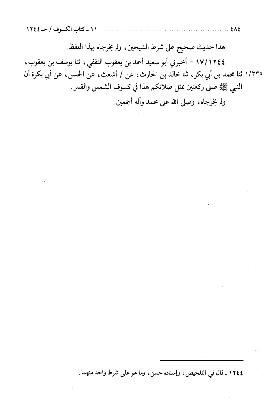 1244 - أَخْبَرَنِي أَبُو سَعِيدٍ أَحْمَدُ بْنُ يَعْقُوبَ الثَّقَفِيُّ، ثنا يُوسُفُ بْنُ يَعْقُوبَ، ثنا مُحَمَّدُ بْنُ أَبِي بَكْرٍ، ثنا خَالِدُ بْنُ الْحَارِثِ، عَنْ أَشْعَثَ، عَنِ الْحَسَنِ، عَنْ أَبِي بَكْرَةَ، «أَنَّ النَّبِيَّ صَلَّى اللهُ عَلَيْهِ وَسَلَّمَ §صَلَّى رَكْعَتَيْنِ بِمِثْلِ صَلَاتِكُمْ هَذَا فِي كُسُوفِ الشَّمْسِ وَالْقَمَرِ» وَلَمْ يُخَرِّجَاهُ، وَصَلَّى اللَّهُ عَلَى مُحَمَّدٍ، وَآلِهِ أَجْمَعِينَ "