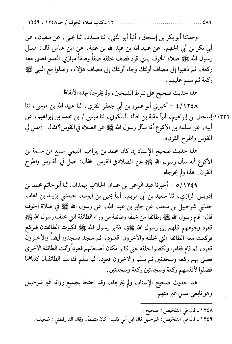 1249 - أَخْبَرَنَا عَبْدُ الرَّحْمَنِ بْنُ حَمْدَانَ الْجَلَّابُ، بِهَمْدَانَ، ثنا أَبُو حَاتِمٍ مُحَمَّدُ بْنُ إِدْرِيسَ الرَّازِيُّ، ثنا سَعِيدُ بْنُ أَبِي مَرْيَمَ، أَنْبَأَ يَحْيَى بْنُ أَيُّوبَ، حَدَّثَنِي يَزِيدُ بْنُ الْهَادِ، حَدَّثَنِي شُرَحْبِيلُ بْنُ سَعْدٍ، عَنْ جَابِرِ بْنِ عَبْدِ اللَّهِ، عَنْ رَسُولِ اللَّهِ صَلَّى اللهُ عَلَيْهِ وَسَلَّمَ فِي صَلَاةِ الْخَوْفِ، قَالَ: §«قَامَ رَسُولُ اللَّهِ صَلَّى اللهُ عَلَيْهِ وَسَلَّمَ وَطَائِفَةٌ مِنْ خَلْفِهِ، وَطَائِفَةٌ مِنْ وَرَاءِ الطَّائِفَةِ الَّتِي خَلْفَ رَسُولِ اللَّهِ صَلَّى اللهُ عَلَيْهِ وَسَلَّمَ قُعُودٌ وُجُوهُهُمْ كُلُّهُمْ إِلَى رَسُولِ اللَّهِ صَلَّى اللهُ عَلَيْهِ وَسَلَّمَ، فَكَبَّرَ رَسُولُ اللَّهِ صَلَّى اللهُ عَلَيْهِ وَسَلَّمَ، فَكَبَّرَتِ الطَّائِفَتَانِ فَرَكَعَ فَرَكَعَتْ مَعَهُ الطَّائِفَةُ الَّتِي خَلْفَهُ وَالْآخَرُونَ قُعُودٌ، ثُمَّ سَجَدَ فَسَجَدُوا أَيْضًا وَالْآخَرُونَ قُعُودٌ، ثُمَّ قَامَ فَقَامُوا وَنَكَصُوا خَلْفَهُ حَتَّى كَانُوا مَكَانَ أَصْحَابِهِمْ قُعُودًا، وَأَتَتِ الطَّائِفَةُ الْأُخْرَى، فَصَلَّى بِهِمْ رَكْعَةً وَسَجْدَتَيْنِ، ثُمَّ سَلَّمَ وَالْآخَرُونَ قُعُودٌ، ثُمَّ سَلَّمَ فَقَامَتِ الطَّائِفَتَانِ كِلْتَاهُمَا فَصَلَّوْا لِأَنْفُسِهِمْ رَكْعَةً وَسَجْدَتَيْنِ رَكْعَةً وَسَجْدَتَيْنِ» هَذَا حَدِيثٌ صَحِيحُ الْإِسْنَادِ، وَلَمْ يُخَرِّجَاهُ، وَقَدِ احْتَجَّا بِجَمِيعِ رُوَاتِهِ غَيْرِ شُرَحْبِيلَ وَهُوَ تَابِعِيٌّ مَدَنِيٌّ غَيْرُ مُتَّهَمٍ "
