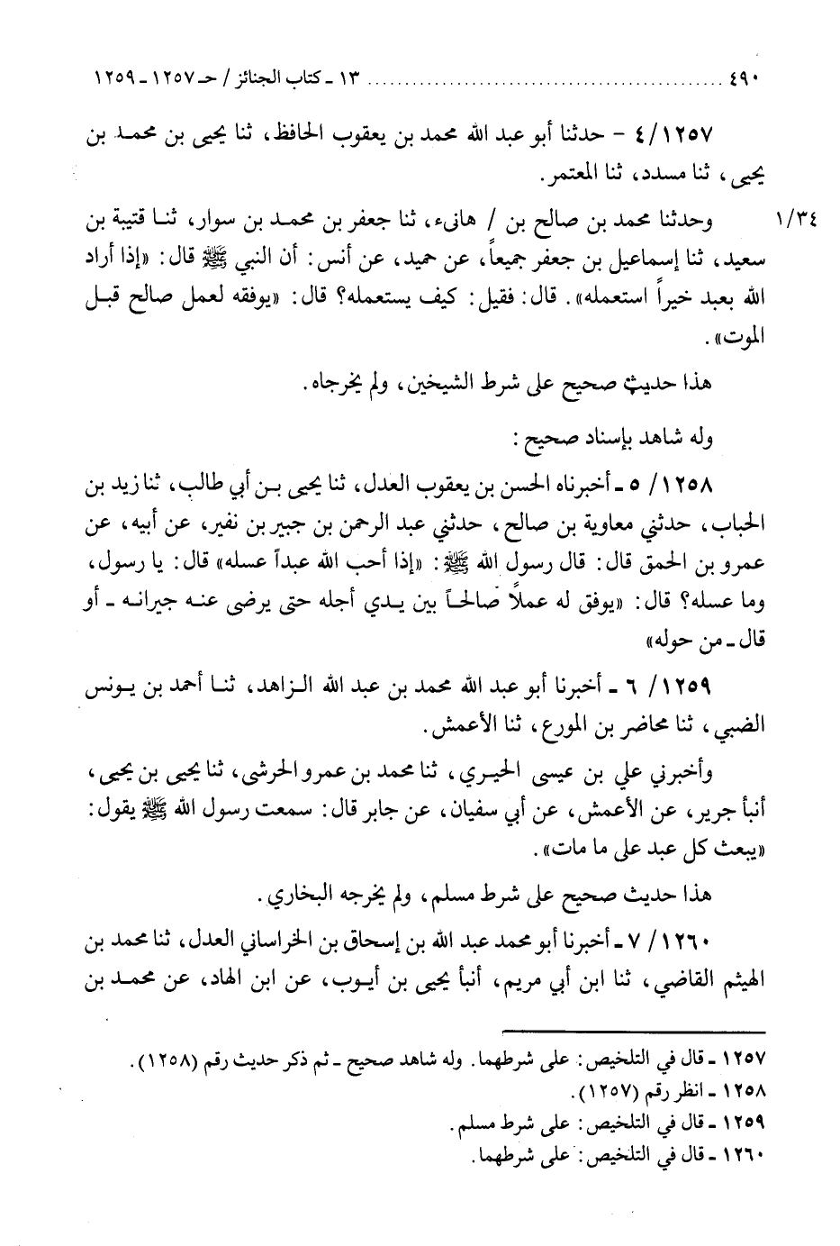 1259 - أَخْبَرَنَا أَبُو عَبْدِ اللَّهِ مُحَمَّدُ بْنُ عَبْدِ اللَّهِ الزَّاهِدُ، ثنا أَحْمَدُ بْنُ يُونُسَ الضَّبِّيُّ، ثنا مُحَاضِرُ بْنُ الْمُوَرِّعِ، ثنا الْأَعْمَشُ، وَأَخْبَرَنِي عَلِيُّ بْنُ عِيسَى الْحِيرِيُّ، ثنا مُحَمَّدُ بْنُ عَمْرٍو الْحَرَشِيُّ، ثنا يَحْيَى بْنُ يَحْيَى، أَنْبَأَ جَرِيرٌ، عَنِ الْأَعْمَشِ، عَنْ أَبِي سُفْيَانَ، عَنْ جَابِرٍ، قَالَ: سَمِعْتُ رَسُولَ اللَّهِ صَلَّى اللهُ عَلَيْهِ وَسَلَّمَ، يَقُولُ: §«يُبْعَثُ كُلُّ عَبْدٍ عَلَى مَا مَاتَ» هَذَا حَدِيثٌ صَحِيحٌ عَلَى شَرْطِ مُسْلِمٍ، وَلَمْ يُخَرِّجْهُ الْبُخَارِيُّ "