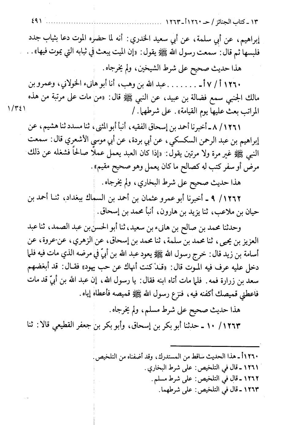 1262 - أَخْبَرَنَا أَبُو عَمْرٍو عُثْمَانُ بْنُ أَحْمَدَ بْنِ السَّمَّاكِ بِبَغْدَادَ، ثنا أَحْمَدُ بْنُ حَيَّانَ بْنِ مُلَاعِبِ، ثنا يَزِيدُ بْنُ هَارُونَ، أَنْبَأَ مُحَمَّدُ بْنُ إِسْحَاقَ، وَحَدَّثَنَا مُحَمَّدُ بْنُ صَالِحِ بْنِ هَانِئِ بْنِ سَعِيدٍ، ثنا أَبُو الْحَسَنِ بْنُ عَبْدِ الصَّمَدِ، ثنا عَبْدُ الْعَزِيزِ بْنُ يَحْيَى، ثنا مُحَمَّدُ بْنُ سَلَمَةَ، ثنا مُحَمَّدُ بْنُ إِسْحَاقَ، عَنِ الزُّهْرِيِّ، عَنْ عُرْوَةَ، عَنْ أُسَامَةَ بْنِ زَيْدٍ، قَالَ: خَرَجَ رَسُولُ اللَّهِ صَلَّى اللهُ عَلَيْهِ وَسَلَّمَ يَعُودُ عَبْدَ اللَّهِ بْنَ أُبَيٍّ فِي مَرَضِهِ الَّذِي مَاتَ فِيهِ، فَلَمَّا دَخَلَ عَلَيْهِ عَرَفَ فِيهِ الْمَوْتَ، قَالَ: «§قَدْ كُنْتُ أَنْهَاكَ عَنْ حُبِّ الْيَهُودِ» ، فَقَالَ: قَدْ أَبْغَضَهُمْ سَعْدُ بْنُ زُرَارَةَ فَمَهْ، فَلَمَّا مَاتَ أَتَاهُ ابْنُهُ فَقَالَ: يَا رَسُولَ اللَّهِ، إِنَّ عَبْدَ اللَّهِ بْنَ أُبَيٍّ قَدْ مَاتَ فَأَعْطِنِي قَمِيصَكَ أُكَفِّنْهُ فِيهِ، «فَنَزَعَ رَسُولُ اللَّهِ صَلَّى اللهُ عَلَيْهِ وَسَلَّمَ قَمِيصَهُ، فَأَعْطَاهُ إِيَّاهُ» هَذَا حَدِيثٌ صَحِيحٌ عَلَى شَرْطِ مُسْلِمٍ، وَلَمْ يُخَرِّجَاهُ "